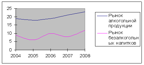 Рисунок 1 На следующей диаграмме представлена динамика изменения объема продаж (процент от общей доли рынка) алкогольной и безалкогольной продукции за 2004-2008 год: