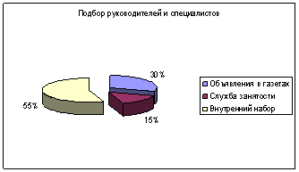 Рисунок 4. Структура источников набора кадров в ООО «Айгуль» Из приведенных диаграмм видно, что при наборе персонала руководство ООО «Айгуль» практически не обращается к специалистам – службам занятости, рекрутинговым фирмам, а осуществляет набор преимущественно из объявлений в газетах. В исследуемой организации присутствует ротация кадров только вертикального характера: сотруднику предлагается более высокая должность на испытательный период, в случае, если он не справляется с представленной должностью, - он возвращается на предыдущее место работы. Причем подбор из внутренних источников осуществляется в основном при наборе сотрудников на руководящие должности, хотя в некоторых случаях эффективность от этого только снижается, поскольку для управления крупной торговой организацией инициативность и креативность важнее, чем трудность адаптации нового сотрудника-менеджера в коллективе. Таким образом, необходимо отметить, что в организации отсутствует четкая, эффективная система подбора персонала. Процесс набора персонала в ООО «Айгуль» осуществляется в два этапа: первый этап – ознакомление с резюме и рекомендательными письмами принимаемого на работу сотрудника или, при отсутствии резюме, заполнение специального заявления, содержащего; второй этап – личное собеседование с сотрудником отдела кадров. Проведение собеседования — самый сложный этап отбора, за короткое время необходимо получить информацию по самым разным темам: - уточнить биографические данные; - выявить общеобразовательный уровень и практический опыт работы; - нарисовать краткий психологический портрет; - прояснить ожидания кандидата от нового места работы. В процессе собеседования видно умение кандидата себя вести, излагать свои мысли – способен ли кандидат ясно понимать свою ответственность перед выбором профессии и перед коллективом, способен ли достойно отстаивать свои права. Данная система недостаточно эффективна, так как она не имеет четкой, ясной структуры, по которой бы каждый раз проходил процесс подбора персонала, при такой высокой текучести кадров необходимо, чтобы процесс подбора контролировался непосредственно директорским составом. При данном подходе процесс проходит более рационализировано – отдел кадров принимает и рассматривает заявление, директорский состав проводит личное собеседование. Анализ эффективности использования персонала начнем с определения количественного и качественного персонала организации (обеспеченность предприятия трудовыми ресурсами и их качественный состав). В таблицах приведен анализ подразделения оптового винно-водочного отдела ООО «Айгуль». Характеристика движения рабочей силы Таблица 2.8