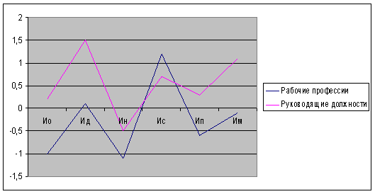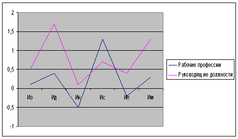 Рисунок 3.2 Где: - Ио – шкала общей интернальности; - Ид – шкала интернальности в области достижений; - Ин – шкала интернальности в области неудач; - Ис – шкала интернальности в области семейных отношений; - Ип – шкала интернальности в области производственных отношений; - Им – шкала интернальности в области межличностных отношений. - Индивидуальный уровень развития волевой регуляции (мера овладения собственным поведением в различных ситуациях, способность сознательно управлять собственными действиями, состояниями). Были получены текстовые характеристики испытуемых, показавшие средний результат волевой регуляции (по 7-бальной шкале от -3 до +3 – средний результат 0,55 баллов). Работа в группе носила дискуссионный характер. При этом выполнялись заявленные перед тренингом правила: а) Не говори больше, чем нужно! б) Не говори меньше, чем нужно! в) Не говори неправды! г) Не отклоняйся от темы! д) Выражайся ясно! Среди типичных трудностей в проведении дискуссии отмечены такие, как нежелание включаться, переключение обсуждения с проблемы на личности, излишняя горячность, отдельные участники – в основном руководящих профессий – говорили слишком много, выступая в роли монополизаторов дискуссии. Помимо общих целей, тренинг для специалистов направлен на обучение его участников специальным приемам, которые позволяют при общении формировать аттракцию (от латинского слова привлекать притягивать), что является важным моментом при производственном общении. Умение владеть приемами расположения к себе людей необходимо везде, в особенности для профессии которые требуют постоянного контакта типа «человек-человек». Специалист вступает в производственное общение для того чтобы: а) отдать распоряжения указания, что-либо порекомендовать, посоветовать получить или передать необходимую для работы информацию материалы и т.д.; б) получить «обратную» (контрольную) информацию от подчиненных о выполнении задания, от коллеги - о выполнении просьбы; в) дать оценку выполнения задания подчиненным коллегам сотрудникам. От того, как складываются взаимоотношения между начальником и подчиненным, коллегами, зависит успешность и эффективность производственной деятельности . Механизм формирования аттракции является достаточно простым, но требует своего постоянного употребления при общении для повышения эффективности последнего. В этих целях на всем протяжении тренинга обучаемые вырабатывают определенные навыки использования ниже перечисленных приемов: 1) прием «Имя собственное» основан на произнесении вслух имени (имени - отчества) человека, с которым вы разговариваете, что способствует возникновению положительных эмоций у собеседника по отношению к вам; 2) прием «3еркало отношений» представляет собой контроль за приветливым, добрым выражением своего лица (вы чаще улыбаетесь друзьям, а не врагам); 3) прием «Золотые слова» заключается в умении говорить комплименты в адрес своего собеседника; 4) прием «Терпеливый слушатель» предусматривает внимательное, заинтересованное выслушивание партнера по общению; 5) прием «Личная жизнь» основан на проявлении интереса к неслужебной сфере жизни человека. Все эти приемы, в конечном счете, вызывают удовлетворение каких-либо потребностей человека, что влечет за собой формирование положительных эмоций и располож