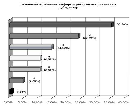 В ходе исследования был предложен один из вопросов: «Перечислите представителей каких молодежных субкультур вы встречали ? Результаты были следующие: 1. Субкультуры, выделенные на основании признака асоциальной направленности и деликвентного / криминального поведения – 2,19% 2. Субкультуры, выделенные на основании признака увлечения различными видами спорта – 6,24% 3. Субкультуры, выделенные на основании способа проведения свободного времени / трудно идентифицируемые – 7,78% 4. Субкультуры, выделенные на основании признака социальной активности и политических взглядов – 20,92% 5. Субкультуры, выделенные на основании признака музыкальных пристрастий, соответствующей моды – 62,87% Следующим вопросом к респондентам был «Представители каких музыкальных субкультур вы встречали ? Ответы распределились следующим образом: “Панки” – 25,13% “Эмо” – 22,32% “Рэперы” – 19,06% “Готы” – 12,94% “Хиппи” – 6,64% “Металлисты” – 5,5% “Неформалы” – 4,01% “Альтернативщики” – 2,98% “Другие” – 1,43% Респондентам задавали вопрос: «Что является основным источником информации о субкультурах?» Результаты получились следующие: - Телевидение – 35,20% - Рассказы друзей – 23,70% - Наблюдаете со стороны, являетесь очевидцем – 14,59% - Сами активно участвуете в жизни какой-либо из субкультур – 10,52% - Газеты, журналы, радио – 10,52% - Интернет – 4,63% - Нет ответа – 0,84%