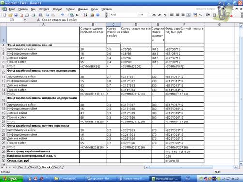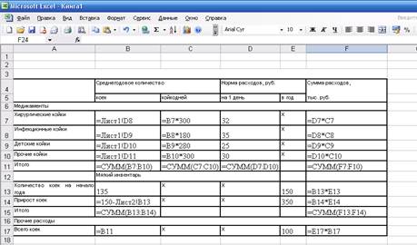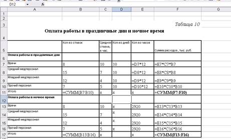 Рис 2. Формулы расчетов расходов на медикаменты, мягкий инвентарь и прочие расходы. Таблица 9. Расчет расходов на заработную плату
