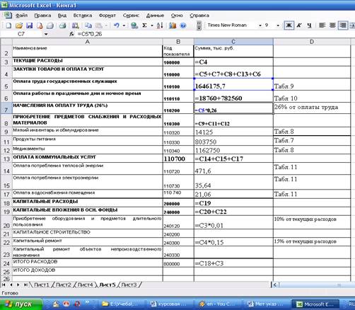 Рис 6. Расчет сметы расходов. Пояснительная записка 1. По заданию 2 необходимо рассчитать и заполнить формы расчетов, для варианта №5 это таблицы 7- 11, 20. 2. В таблице 7, располагая данными о количестве коек на начало и конец планируемого года и сведениями о сроках развертывания сети, определяют среднегодовое количество коек. Расходы на питание больных определяются исходя из среднегодового количества коек, денежных норм на питание и числа дней функционирования. 3. В таблице 8 расходы на медикаменты, мягкий инвентарь, прочие расходы исчисляются исходя из среднегодового количества коек и денежных норм. 4. В таблице 9 Расходы на оплату труда определяется по врачам, среднему, младшему медицинскому персоналу, прочему персоналу по видам и профилям коек исходя из средней ставки заработной платы и числа ставок на I койку. Фонд заработной платы увеличивается на средний процент повышения за непрерывный стаж работы. 5. В смете расходов больницы отдельно предусмотрены затраты на оплату работы в праздничное и ночное время с учетом количества часов дежурств, количества занятых ставок и среднечасовой ставки заработной платы. Эти расчеты отражены в таблице 10. 6. Располагая данными о лимитах потребления энергоресурсов и тарифах на них, определяем сумму ассигнований на коммунальные и прочие услуги. Заполняем таблицу 11. 7. На основании расчетов предыдущих таблиц заполняем смету расходов городской поликлиники. 8. Подробные расчеты таблиц показаны на рисунках по ходу выполнения данной работы. 9. Итого расходов на содержание городской больницы составило 5 633 719,43 тыс. руб., из которых 777 064,75 тыс. руб. составляют капитальные расходы, и 4 856 654,68 тыс.руб. – текущие расходы. 10. Сделать выводы о достаточности выделенных ассигнований на содержание больницы не удалось за неимением показателей дохода данной больницы. Заключение По итогам проведенного исследования теоретической части сделаем следующие выводы: На территории Российской Федерации создаются и действуют библиотеки различных форм собственности в порядке, установленном действующим законодательством Российской Федерации и настоящим федеральным законом. Библиотека - информационное, культурное, образовательное учреждение, располагающее организованным фондом тиражированных документов и предоставляющее их во временное пользование физическим и юридическим лицам; библиотека может быть самостоятельным учреждением или структурным подразделением предприятия, учреждения, организации. Общедоступная библиотека - библиотека, которая предоставляет возможность пользования ее фондом и услугами юридическим лицам независимо от их организационно-правовых форм и форм собственности и гражданам без ограничений по уровню образования, специальности, отношению к религии. В дальнейшем развитие корпоративных библиотечных систем должно привести к тому, что библиотеки, наряду с генерированием сводных электронных каталогов путем распределения обработки новых поступлений совместными усилиями, будут: · создавать полнотекстовые базы данных (электронные библиотеки) путем формирования в электронном виде своей части коллекции, доступной для удаленных пользователей; · организовывать службы заказа электронной доставки документов; · интегрировать корпоративные ресурсы в мировое информационное пространство; · 