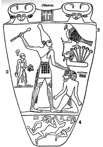 Рисунок 4 – Таблица Нармера Иератическое письмо представляет сложность не столько из-за необходимости трактовать рисунки (как это происходит в ранней иероглифике), сколько из-за необходимости для писца выразить в тексте самые разные грамматические понятия, а не одну только семантику слова. Скажем, при записи врачебного рецепта – снадобья, в которое входил корень какого-то растения, писец для обозначения корня (по древнеегипетски «корень» звучит как менит) должен был нарисовать значок слога «мен», означавший одновременно и саму букву «М», отметить далее буквы «Н» и «Т», а затем поместить рядом со словом значок-детерминатив, относящий написанное слово в группу «растительной» лексики. Египетская письменность представляет собой определенную сложность при расшифровке еще и потому, что не существовало четкого стандарта оформления текста. Писали либо горизонтальными строчками, читавшимися как слева направо, так и справа налево, либо вертикальными колонками, которые читались только сверху вниз. Египетские писцы не брезговали никаким материалом, пригодным для письма. Надписи иероглифическими и иератическими письменами делались на камне, на глине, на пергаменте и на папирусе (это был наиболее распространенный писчий материал). 2.2 Литература Первоначально письменность применялась исключительно в хозяйственных или в сакральных целях. От эпохи Древнего царства до нас практически не дошло памятников письменности, за исключением иероглифических хвалебных надписей и молитв на стенах гробниц. Первые хозяйственные документы представляют собой скудные записи о том, что «принесено столько-то туш животных, собрано столько-то снопов ячменя с одного поля». Конец Древнего царства в истории письменных памятников Древнего Египта отмечен распространением надгробных надписей хвалебного характера. Возвышение культа Осириса и связь мифа об умирающем и воскресающем Осирисе в связи с культом мертвых порождают первые памятники заупокойной литературы, которые можно причислить к литературным произведениям. На стенах гробницы богатого человека записывается от его лица вся «автобиография» – перечисляются заслуги перед фараоном, личные доблести, описывается богатство усопшего и положение, которое он занимал при жизни. Это – так называемые «Тексты пирамид», древнейшие из текстов, составивших много столетий спустя канон «Книги мертвых». Очевидно, в эпоху Древнего царства культурная традиция сохранялась исключительно в устном творчестве. Сложилась эта традиция еще раньше – основные мифы египтян, положенные в основу значительного числа литературных произведений, относятся к периоду додинастического Египта. Расцвет древнеегипетской литературы – Среднее царство. В это период появляются письменные произведения, составившие костяк классической литературы Древнего Египта. Прежде всего, следует отметить произведение, продолжающее традицию гробничных надписей – «Повесть о Синухете». Это жизнеописание получило чрезвычайно широкое распространение и дошло до наших дней во множестве списков, причем сделанных и в гораздо более позднее время. Синухет, как следует из этого произведения – вельможа, живший при дворе двух фараонов. Скорее всего, это не просто историческая личность. Синухет, возможно, сам был автором своего жизнеописания. О