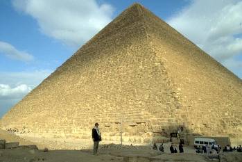 Рисунок 3 – Пирамида Хеопса Никакие цифры не позволят составить более-менее яркое представление о Великой пирамиде Хеопса (изображение приведено на рисунке 3). И все-таки попробуем: высота пирамиды – 146,6 м. Длина нижней грани у основания пирамиды – 233 м. Вес каменных блоков, пошедших на ее изготовление – от 2 до 30 тонн. Общее количество этих блоков – два миллиона триста тысяч. Срок строительства – двадцать лет плюс десять лет, затраченных на подготовку дороги от каменоломен к строительной площадке. Количество работников, возводивших пирамиду – по сто тысяч человек каждый год, работавших посменно на «царских работах». То, что пирамиды возводились с применением инженерной техники, более сложной, чем простые системы блоков и рычагов, очевидно. Точность подгонки многотонных каменных блоков друг к другу настолько высока, что ее вряд ли было возможно добиться одним лишь использованием мускульной силы сотен тысяч строителей. По меньшей мере, египетские инженеры обладали великолепными измерительными инструментами. Способ же установки каменных глыб остается загадкой до сих пор, хотя выдвигались и продолжают выдвигаться самые различные гипотезы на этот счет. В эпоху Среднего царства общее направление заупокойной архитектуры изменилось. Прежде всего, фараоны более не воздвигали себе усыпальниц, способных соперничать с пирамидами Древнего царства. Царские усыпальницы стали гораздо скромнее и меньше размерами, хотя по-прежнему доминировала пирамидальная форма надгробия. Основной упор в погребальном комплексе делался отныне не на саму гробницу, а на заупокойный храм (эти храмы еще со времен пирамиды Джосера стали обязательным элементом любой гробницы, но на фоне Великих пирамид заупокойные храмы, игравшие центральную роль в посмертном культе царя, оказывались практически незаметны). С возрастанием роли храмов вырос и уровень их архитектурного исполнения. В эпоху Среднего царства были заложены и разработаны основные принципы египетского храмового строительства, доведенные до апогея в богатом Новом царстве. Зато несравненно большей пышностью отличаются гробницы знати эпохи Среднего царства. Возросшее и укрепившееся влияние номархов в стране позволило им обеспечивать себя после смерти с пышностью, способной потягаться с усыпальницей самого фараона. Номархи Среднего царства строят свои посмертные обиталища в скалах, вырубая в недрах горного массива величественные храмы с колоннадами, превосходные как по внутренней отделке помещений, так и по техническому решению – проблема, как и в случае с пирамидой Хеопса, состояла не столько в том, чтобы прорубить в толще скалы коридоры и комнаты, сколько в том, чтобы вся конструкция выдержала неимоверную тяжесть. Наконец, эпоха Нового царства явила собой вершину пышности и великолепия в архитектуре. Речь уже не идет только о заупокойных сооружениях. Храмы и дворцы, возводившиеся живыми для живых в эти времена невиданного расцвета и богатства Кеми, поистине великолепны. Храмы в эпоху Нового царства в основном строили прямоугольными, выходящими фасадом на Нил. Помимо нескольких колонных залов, их богато украшали статуями, настенными рельефами и росписями. Последующие века уже не привнесли ничего принципиально нового в архитектуру – ни в гражданскую, ни в храмовую. Совершенствован