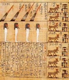Рисунок 6 – Фрагмент папируса «Книга мертвых» Часть исторических произведений этого типа представляет собой трансформацию давней гимновой традиции, берущей свое начало в гробничных надписях фараонов и распространенной еще в эпоху Среднего царства. 3. Верования, традиции, обычаи древних египтян 3.1 Религия Религиозные воззрения древних египтян – та сторона древнеегипетской цивилизации, которая, возможно, более прочих притягивает современного человека. Европейская культура выросла из верований и мировоззрения других культур Древнего мира – с одной стороны, иудейской, с другой – греко-римской. Египетская же культура и ее основа, религиозное мировоззрение – явление абсолютно уникальное. Религиозное мировоззрение и мифология Древнего Египта сформировались в течение нескольких тысячелетий под взаимным влиянием верований охотничьих, скотоводческих и земледельческих племен. Характерная особенность системы верований древних египтян – ее консервативность. Крайне медленное развитие государства, практически неизменный общественный уклад способствовали длительному сохранению древнейших культов, в частности, фетишизма и в особенности тотемизма. Существует, в частности, версия о том, что строительство пирамид, помимо чисто египетского культа мертвых, связано еще и с отголосками древнего фетишизма и почитания камня. Религия Древнего Египта крайне символична, и ее символизм тесно связан с культом природы и естественных сил. Поклонение стихиям во всех их проявлениях – черта всех древнейших верований человека. Характер этих верований изменялся в стране Кеми в зависимости от того, как изменялся образ жизни ее обитателей. Первоначальные верования древних египтян складывались как верования охотничьих племен. Этим объясняется преобладание анималистических элементов – обожествления различных животных, в которых воплощались боги-покровители племени, помогавшие охотникам. Впоследствии поклонение некоторым из этих божеств вошло и в культ скотоводческих племен. Анимализм вообще наиболее характерная черта древнеегипетской религии, сохранившаяся вплоть до позднего периода развития египетской цивилизации и лишь усилившаяся ближе к концу существования Древнего Египта. Пантеон Древнего Египта складывается в ту пору, когда египтяне переходят к оседлому образу жизни и к земледелию. С этим переломным этапом связано обожествление земли и воды. Божества, связанные с этими началами, в более позднее время заняли главнейшие позиции в системе верований древних египтян. Особое место занимал в этой системе культ бога Солнца. В разные исторические периоды его олицетворяли различные боги. В эпоху Древнего царства верховным богом Египта стал Ра, позднее его сменил Амон, которому поклонялись в Фивах – столице фараонов Среднего и Нового царства. Формирование политической и административной системы страны также оказывало влияние на становление системы верований. Номы, территориально сложившиеся еще в додинастический период, имели каждый собственных богов, зачастую выступавших в разных местах в одних и тех же обличьях, но носивших иное имя. В каждом номе имелась триада верховных божеств, вокруг образов которых складывались местные мифы. По мере объединения страны происходило слияние многих богов, связанное с возвышением тех или