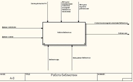 Курсовая работа: Проектирование информационной системы "Библиотека"Курсовая работа: Проектирование информационной системы "Библиотека"Министерство образования и науки Российской Федерации Государственное образовательное учреждение высшего профессионального образования «Горно-Алтайский Государственный Университет» Экономический факультет Кафедра прикладной информатики КУРСОВАЯ РАБОТА ПРОЕКТИРОВАНИЕ ИНФОРМАЦИОННОЙ СИСТЕМЫ «БИБЛИОТЕКА» Выполнила: студентка IV курса 836 группы Пирогова Е.В. Научный руководитель ст. преподаватель Михайлов М.В. Горно-Алтайск 2010 Содержание Введение Глава 1. Основы библиотечной деятельности 1.1 Организация деятельности библиотеки 1.2 Законы РФ, регулирующие библиотечную деятельность 1.3 Формирование библиотечной статистики Глава 2. Проектирование ИС «БИБЛИОТЕКА» 2.1 Общая характеристика BPwin 2.2 Методологии, используемые в BPwin 2.3 Проектирование модели деятельности библиотеки BPwin 2.4 Диаграммы декомпозиции 2.5 Проектирование деятельности библиотеки в среде ERwin Заключение Список используемой литературы Приложения Введение Библиотека (греч. bibliothēkē, от biblíon – книга и thēkē – хранилище), культурно-просветительное и научно-вспомогательное учреждение, организующее общественное пользование произведениями печати. Библиотеки систематически занимаются сбором, хранением, пропагандой и выдачей читателям произведений печати, а также информационно-библиографической работой. Это информационное, культурное, образовательное учреждение, располагающее организованным фондом документов и представляющее их во временное пользование абонентам, а также осуществляющее другие библиотечные услуги. Деятельность библиотеки складывается из трех основных составляющих: хранение, поиск, и выдача на определенное время, имеющихся в наличие книг. Актуальность данной темы заключается в том, что многие библиотеки до сих пор придерживаются, традиционных библиотечных систем и процессов. Необходим, переход от бумажной коммуникации к коммуникации безбумажной, чтоб сократить время поиска необходимой литературы, информации о читателе и т.д. В последнее время информационные технологии стали неотъемлемой частью нашей жизни. Экономические информационные системы, связанные с предоставлением и обработкой информации для всех уровней управления экономическими объектами, приобретают особую важность в общественной жизни. На данный момент невозможно представить какую-либо организацию, не применяющую компьютерных технологий. Это обусловлено и тем, что государственные структуры требуют обязательных отчетов в электронном виде, следовательно, необходима систематизированная информация. Начальным этапом создания системы является изучение, анализ и моделирование деятельности организации для возможного улучшения и оптимизации методов работы. В курсовой работе используется инструментальное средство для моделирования BPwin и ERwin. Целью данной курсовой работы является моделирование информационной системы библиотеки, которая позволит улучшить эффективность выполнения процессов, происходящих в библиотеке. Основными задачами данной работы являются: – изучить теоретические особенности моделирования процессов организации средствами BPwin и ERwin – произвести исследование предметной области – библиотечной деятельности – 