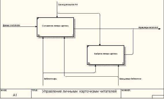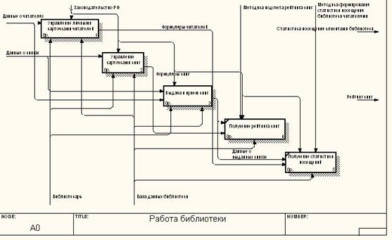 Рис.1. − Контекстная диаграмма Основные информационные потоки: - Входящие потоки: · Данные о читателях (паспортные данные читателей); · Данные о книгах (название, издательство, год издания и др.). - Управляющие потоки: · Законодательство РФ (законы, ГОСТ, правила); · Методика формирования статистики посещения библиотеки читателями; · Методика подсчета рейтинга книг. - Ресурсные потоки: · База данных библиотеки (БД «Библиотека»); · Библиотекарь. - Выходящие потоки: · Статистика посещения клиентами библиотеки (график); · Рейтинг книг (график). Созданная модель описывает деятельность библиотеки. Объектом моделирования является библиотека. Система рассматривается с точки зрения директора библиотеки. 2.4 Диаграммы декомпозицииПосле описания системы в целом проводится разбиение ее на крупные фрагменты. Этот процесс называется функциональной декомпозицией, а диаграммы, которые описывают каждый фрагмент и взаимодействие фрагментов, называются диаграммами декомпозиции. После декомпозиции контекстной диаграммы проводится декомпозиция каждого большого фрагмента системы на более мелкие и так далее, до достижения нужного уровня подробности описания. Так достигается соответствие модели реальным процессам на любом и каждом уровне модели. Синтаксис описания системы в целом и каждого ее фрагмента одинаков во всей модели. После декомпозиции контекстной диаграммы «Библиотечная система» возникло пять диаграмм декомпозиции: · Управление личными карточками читателей; · Управление карточками книг; · Выдача/прием книг; · Получение рейтинга книг; · Получение статистики посещений.