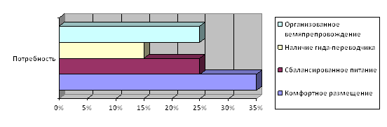Виза в Россию [17]. 1.1.4 Характеристики фокус-группы по исходному турпродуктуВозрастная категория фокус-группы - люди от 18 до 60 лет. Наши потенциальные клиенты - это люди с достатком выше среднего, путешествующие 1-2 раза в год. Такие туры пользуются популярностью у людей, интересующихся культурой и историей России, желающих расширить свой кругозор и получить новые впечатления. Изучая целевую группу, нами было выявлено, что: § Ценовые предпочтения наших потенциальных покупателей 26863 руб. /день § Целевые предпочтения туристов - знакомство с культурой, искусством и бытом России. § С географической точки зрения фокус-группа проживает на всех континентах. § По критерию количественных предпочтений - туристы, предпочитающие путешествовать в одиночку или с семьёй. § По критерию класса обслуживания - первый класс. 1.1.5 Уточнение потребностей потребителей и выявление недостатков продукта на основе анализа мнений потребителейПроанализировав отзывы клиентов на сайте [6] мы смогли понять, что клиенты довольны оказанными им услугами. Для клиентов была важна скорость обслуживания и качество оказываемых услуг гидом, который по отзывам [6] давал огромное количество информации и владел в совершенстве английским языком. Были изучены различные сайты: [6], [17], [18]. Потребности: в комфортном размещении, в качественном и сбалансированном питании, в хорошем англоговорящем гиде-переводчике, в организованном и интересном времяпрепровождении.