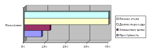 Недостатки, выявленные по отзывам клиентов: 1) Долгие переезды между городами 2) Плохие отели 3) Завышенные цены на товары для туристов 4) Опасные ситуации, связанные с наличием преступности