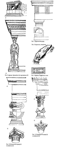 Микенские крепости, дворцы и гробницы Микенская культура достигает своего развития после 1450 г. до н.э. К этому времени микены господствуют над всей эгейской областью и даже закладывают на удаленных территориях свои колонии. Микенские поселения фактически представляли собой крепости, за стенами которых выложенными из плотно пригнанных каменных блоков, укрывались дворцы правителя. Ядром дворца был мегарон с расположенным в центре очагом. К этому помещению, служившему залом для пиршеств, вели многочисленные коридоры, дворы и колонные портики, пропилеи. Комнаты дворца были расписаны фресками. Заслуживают внимания гробницы (отчасти сохранившиеся), представлявшие собой круглые в плане подземные сооружения (камеры), перекрытые ложным куполом, создаваемым за счет выступа каждого последующего ряда камней над предыдущим. Подобную конструкцию имеют и ложные своды для перекрытия коридоров в крепостных сооружениях в Тиринфе. Из гробниц наиболее известна так называемая Сокровищница Атрея (недалеко от Микен). Ее диаметр — 14 м, высота купола — 13 м. В качестве несущих элементов для плоских перекрытий использовались стены, пилоны и колонны. Последние имели деление на базу, ствол и капитель. База простой формы была плоской, ствол имел конусообразную форму с сужением книзу, приплюснутая капитель состояла из круглого эхина и квадратного абака над ним (рис. 4). Для уменьшения нагрузки на перемычку над входом в вышележащем массивном каменном блоке стены организовывалось треугольное отверстие, прикрывавшееся тонкой плитой, украшенной рельефом. Характерным примером в этом плане являются так называемые Львиные ворота Микенского акрополя (рис. 2). Микенская культура погибла в период около 1100 г. до н.э. Архитектура Древней Греции Культура греков, а позднее римлян, занимает важное место в истории развития всей европейской культуры. Это культура античности зрелого рабовладельческого общества, достигшего наивысшего расцвета в V в. до н.э. (в Афинах при Перикле). Первые археологические раскопки ее начаты в Геркулануме и Помпеях в начале XVIII в. Во втором тысячелетии до н.э. греческие племена и, в частности, дорийцы захватывают микенские территории и приносят с собой иной способ жизни и познания о железе. Местное население заселяет острова Эгейского моря и побережье Малой Азии. Возникает множество городов-государств (как, например, Афины и Спарта), соперничающих между собой, но одинаково воспринимающих искусство и архитектуру. Периоды развития греческой архитектуры Ранний период развития архитектуры (до V в. до н.э.) получил название архаического. В бронзовом веке храмы еще не строились. Только в первой половине VIII в. появляется храм, планировочную основу которого составил микенский мегарон. Он был сооружен из необожженного кирпича, крыша выполнена двускатной из дерева, а основной объем здания окружен колоннадой, что в последующем заложено в архитектуру греческих храмов (рис. 5). Одним из первых такой храм богини Геры построен на острове Самосе. В течение VII в. строительное искусство развивалось в рамках нескольких стилей. Дорический стиль сформировался около 600 г. до н.э. и в дальнейшем лишь незначительно изменялся. Примером может служить дорический храм Геры в Олимпии. Ионический стиль в V в. еще окончательно не сформировался. Оба указанных выше стиля