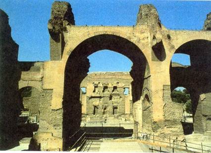 Мастера перестали изображать пышные волосы, почти убирали усы и бороду и до предела обнажали пластический костяк. На зрителя смотрят затравленные роком властители позднего Рима, вовлечённые в вечную борьбу за императорскую власть. В римской архитектуре 111 в. особой грандиозностью выделяются Термы (бани) Каракаллы. Термы для римлян были чем-то вроде клуба, где древняя традиция ритуальных омовений постепенно обросла комплексами для развлечений и занятий: палестрами и гимназиями, библиотеками, Руины Терм Каракаллы. III в. помещениями для музыкальных занятий. Посещать бани было любимым занятием римского плебса, желавшего вместо труда «хлеба и зрелищ». Бани — как частные, так и государственные, мужские и женские (или общие), простые и такие шедевры архитектуры, как у Каракаллы, — были разбросаны по всей империи В каждом провинциальном городе были свои бани. Термы Каракаллы занимали колоссальную площадь с газонами, имели залы горячей, тёплой и холодной воды (калдарий, тепидарий, фригидарий). Они представляли собой сложные архитектурные сооружения, перекрытые сводами разных конструкций — высшее достижение инженерного гения. Их руины до сих пор поражают величием. А современники Каракаллы могли любоваться и блеском полудрагоценных камней, и позолотой, и мозаикой, и богатым декором, покрывавшим стены и своды терм. В римских провинциях продолжался расцвет градостроительства, там были богатые заказы, туда устремлялись лучшие мастера из Рима. Общий уровень цивилизации во всей Римской империи в то время был высок как никогда — вплоть до далёкой Британии, куда доходил уже Адриан и где окончил свои дни Септимий Север. Античный романизированный мир стал приобретать, несмотря на местные различия, некий единый облик. О базилике как сооружении, весьма распространённом у римлян, следует сказать особо. Тип базилики (от греч. «базилике» — «царский дом») — прямоугольного вытянутого здания для общественных собраний и советов — возник уже в Греции в III в. до н. э. Здание разделялось продольными рядами опор (колонн, столбов) на несколько проходов — нефов. Средний неф был обычно выше и шире боковых и освещался через окна над боковыми частями. Чаще всего он завершался выступом — апсидой. Впоследствии архитектурная форма базилики использовалась как образец для строительства христианских храмов. На родине Септимия Севера, в Лептис Магне (Северная Африка), была построена базилика, которая отличалась от всех прежних особым замыслом и роскошью отделки На узких сторонах, восточной и западной, у неё были две полукруглые ниши — апсиды. Обрамлявшие их пилоны (столбы) посвящались Дионису и Гераклу и были украшены сценами их подвигов. С этими двумя героями античности отождествлял себя император. Так уже поступал Александр Македонский в IV в. до н. э., бросая вызов небесам. Теперь в это начинали веровать буквально. Дионис и Геракл — два главных божества позднеантичного мира. Их почитали повсюду, но Дионис намного популярнее. На замечательных римских саркофагах, которые воплощают духовный мир позднего Рима, Дионис побеждает Геракла. На знаменитом «саркофаге Уварова» из Государственного исторического музея (Москва) Дионис опьяняет героя, считавшегося воплощением разума, воли и недюжинной физической силы. Дионис вершит ритуал его смерти и возрождения. Ведь о
