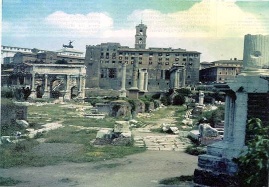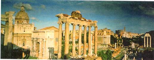 Город Рим, основанный 19 апреля 735 г. до н.э., вначале был скромным посёлком, но со временем он набирал всё большую силу и впитывал лучшие творческие веяния, шедшие со стороны. Главной святыней Рима являлся храм Юпитера, Юноны и Минервы на Капитолийском холме. Храм не сохранился, но учёные предполагают, что он был распланирован по этрусскому образцу: с глубоким передним портиком, высоким цоколем и лестницей, ведущей к главному входу. Форум Романум. Вид сверху.