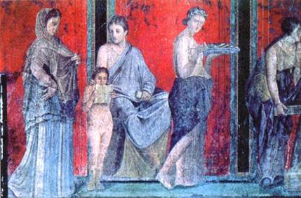 Внутри дома были расписаны. Прекрасно сохранившиеся фрески показывают, какой была обычная жизненная среда римлянина. Ранние дома (II — конец I в. до н.э.) расписывали в так называемом первом пампейском стиле. Стены домов были расчерчены геометрическим орнаментом, который напоминал обкладку стен полудрагоценными камнями. Затем этот «инкрустационный» стиль сменился «архитектурным», или вторым пампейским. Он был в Настенная роспись из Виллы Мистерий. I в. до н.э. моде в течение I в. до н.э. Мастера второго помпейского стиля превращали интерьер в подобие городского пейзажа. Во всю высоту стен шли изображения колоннад, всевозможных портиков, фасадов зданий. В росписях появились и фигуры людей. В пампейской Вилле Мистерий, названной так по изображениям в одном её помещении загадочной сцены, имеется прекрасный пример подобной росписи. Ритуальная комната буквально насыщена «огнём»: на красных стенах в натуральный рост представлены фигуры участников дионисийского таинства. Архитектурные членения помогают упорядочить очень сложную сцену, ядром которой выступает миф о возрождении бога Диониса в браке с Ариадной (они изображены на центральной стене сидящими). На этом фоне разворачивается картина ритуального действа, в котором принимают участие вполне реальные люди. Начало и конец композиции обрамлены фигурами женщин. Одна стоит, обращаясь в глубь комнаты, другая задумчиво, с иронией наблюдает за происходящим. Возможно, весь мистериальный эффект был рассчитан на хозяйку дома — новобрачную, поскольку у обеих фигур (одна и та же женщина в двух ипостасях) на пальце изображено обручальное кольцо. 2. КУЛЬТУРА РАННЕЙ ИМПЕРИИ
