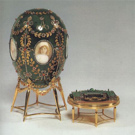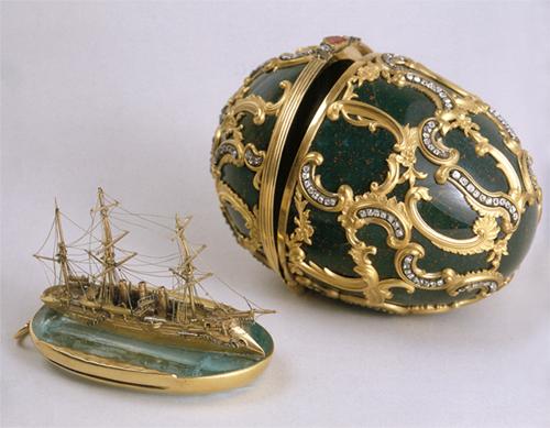 (Золото, платина, серебро, бриллианты, алмазы огранки «роза», рубин, аквамарин, гелиотроп, бархат) Подарок императора Александра III императрице Марии Федоровне на Пасху 1891 года.