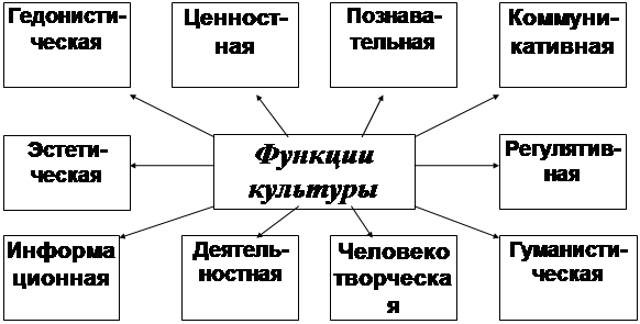 Реферат: Функции культурыРеферат: Функции культурыСАМАРСКИЙ ГОСУДАРСТВЕННЫЙ МЕДИЦИНСКИЙ УНИВЕРСИТЕТ КАФЕДРА СЕСТРИНСКОГО ДЕЛА Курсовая работа на тему: “Функции культуры” Выполнила: студентка факультета ВСО 186 группы Баринова Юлия Юрьевна Проверила: Кичатова Елена Юрьевна Сызрань 2000 год План I. Понятие “культура”. II. Функции культуры: 1. Познавательная (гносеологическая) функция 2. Человекотворческая функция 3. Деятельностная функция 4. Информационная функция 5. Коммуникативная функция 6. Регулятивная (нормативная) функция 7. Ценностная (аксиологическая) функция 8. Эстетическая функция 9. Гедонистическая функция 10. Гуманистическая функция III. Заключение. Понятие “культура”. Человек живет в мире вещей, но и в мире понятий. Одни из них отражают наш повседневный быт и доступны для каждого, другие — лишь узкому кругу посвященных. Но есть и такие понятия, которые за своей кажущейся простотой скрывают вселенную человеческих страстей и интеллектуального сверхнапряжения в поисках ответа на вопрос: что такое человек и в чем смысл его бытия? Одно из таких понятий — культура. Понятие «человек» и «культура» неразрывно связаны друг с другом. Почвоведение оперирует термином «гумус» (показатель плодородия почвы). В контексте взаимосвязи человека и культуры напрашивается метафорический вывод о том, что уровень «духовного плодородия» человека, его «духовного гумуса» в существенной степени определяется воздействием на него культуры, и в частности таких ее инструментариев, как воспитание, образование, развитие творческих задатков. Образно говоря, древо человечества может произрастать и плодоносить лишь на богатой культурной почве. Культура многогранна, и только в системе ценностей можно достаточно содержательно понять ее проявления. А проявления ее бесконечны. Можно говорить о культуре человечества, о культурах различных эпох (античная, средневековая и т.д.), о культурах различных этносов и стран (русской и России, французской и Франции), о религиозных культурах (буддийской, исламской, христианской), культурах различных социальных и профессиональных групп (крестьянской, помещичьей, городской, сельской .) и даже о культуре отдельных личностей (Пушкина, Конфуция и др.). Многогранность культуры нашла свое отражение в многочисленных попытках ее определения и в разнообразии самих подходов к ее определению (антропологический, философский и социологический). Прежде всего, необходимо подчеркнуть мысль, что понятие "культура" относится к числу тех общеисторических категорий, которые имеют силу для всех эпох. Культура возникает вместе с появлением на земле человечества, и каждый шаг человека по пути общественного прогресса был одновременно шагом вперед в развитии культуры, каждая историческая эпоха, каждая особая форма общества обладала своей, только ей свойственной культурой. Человек осознает себя культурным существом в той мере, в какой освобождается от власти внешних и первоначально еще чисто природных сил. Культура осознается, как то, что порождено, создано самим человеком в отличие от того, что существует независимо от него. В этом смысле можно сказать, что в открытии культуры нашло выражение осознание человеком своей зависимости от самого себя, от своей деятельности, от собственной творчески-продуктивной мощи. Этот вывод подтверж