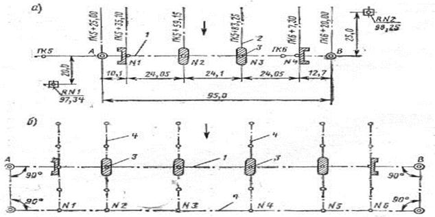 При возможности разбивки опор по створу светодальномером в качестве основы могут служить исходные пункты, закрепляющие ось мостового перехода. Эти пункты закрепляют еще в период изысканий. Разбивка осей опор При разбивке осей опор малых и средних сооружений центры опор переносят на местность непосредственным измерением расстояний между знаками (см. пункты А и В на рис.1, а), закрепляющими ось сооружения, и центрами опор, привязанными в проекте к пикетажу дороги.