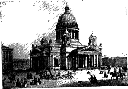 О. Монферран Исаакиевский собор. Литография с рисунка автора. 1845 На долю Витали выпало создание большей части скульптур, в том числе тех, которым были отведены важные места на фасадах: двенадцать статуй евангелистов и апостолов над фронтонами, группы коленопреклоненных ангелов со светильниками на углах аттика, статуи ангелов над угловыми пилястрами, три большие бронзовые двери, барельефы на двух колоссальных фронтонах — «Встреча императора Феодосия с Исаакием Далматским» и «Поклонение волхвов». В процессе грандиозной работы Витали должен был решить сложную задачу согласования скульптуры с архитектурой собора. Сюжет рельефа западного фронтона «Встреча императора Феодосия с Исаакием Далматским» выражает идею союза монархии и православной церкви. В построении рельефа подчеркнуто единство этих сил. В центре композиции группа из трех фигур — римский император Феодосии, его жена Флаксила и св. Исаакий, только что освобожденный из темницы. Справа на первом плане два склоненных воина; один из них кладет к ногам Исаакия дикторские знаки. На втором плане — Сатурин и Виктор, вельможи из свиты императора, сделавшие богатое пожертвование в пользу православной церкви. Лицам их приданы черты президента Академии художеств А. Н. Оленина и князя П. В. Волконского. В левом углу помещено изображение Монферрана, в руках его модель собора. Скульптура выполнена обобщенно. Ее контуры создают лаконичный и вместе с тем выразительный силуэт. Несколько иначе выполнен рельеф южного фронтона «Поклонение волхвов». Композиция подчинена треугольным очертаниям фронтона, построена симметрично по отношению к центру, занятому стройной фигурой Марии. Мерный ритм движения фигуры волхвов, эффектно задрапированных в широкие одеяния, придает сцене почти придворную торжественность. Такое решение соответствует принципам классицизма. Однако некоторые особенности этого рельефа говорят об иных исканиях. Скульптор стремился к подробному изображению событий, к конкретизации обстановки. Композиция построена так, что ряд деталей выступает за пределы карниза (одеяния волхвов у ног Марии). При высоком рельефе самих фигур это усиливает впечатление «реальности» изображенного. Действие как бы выходит за плоскости фронтона в окружающее пространство. Скульптурная композиция фронтона уже не принадлежит только зданию. Нарушена та мера условности, которая свойственна искусству классицизма. С большим вниманием изображена фактура материалов — драпировки, обувь, а также лица, волосы. Барельеф восточного фронтона выполнен скульптором Лемером на сюжет «Исаакий Далматский останавливает императора Валента». Исаакий предлагает императору прекратить гонение на православных христиан, предсказывая ему в противном случае скорую гибель. В центре композиции — император верхом на лошади в окружении воинов, перед ним Исаакий. В решении этого рельефа известную трудность представляло изображение конной фигуры среди группы людей. В этом случае важно, не потеряв масштабности, согласовать ее пропорции с соседними фигурами и общей конфигурацией фронтона. Другое произведение Лемера - барельеф на северном фронтоне — построено строго симметрично. Вся композиция разделена на две части, объединенные фигурой Христа. Подчеркнув значение ее в общей композиции, скульптор подро