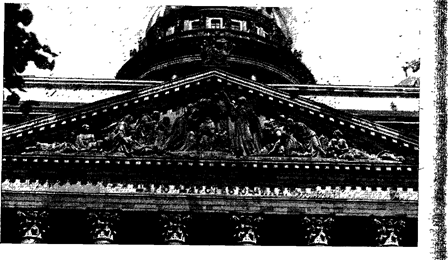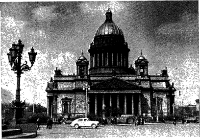Исаакиевский собор. Южный фасад. Фотография. 1978. материалов здесь уделено меньше внимания, чем в рельефах фронтонов. В общем решении всех скульптур. Витали придерживался традиций русского классицизма. Но' внимание к эффектам светотени, стремление к передаче характерности некоторых лиц выделяет статуи апостолов среди работ других скульпторов этого времени. Кроме того, фигуры апостолов обладают большой динамичностью. Энергично жестикулируя, эти персонажи словно делают шаг вперед, наклоняя головы и слегка поворачивая их как бы к зрителю, Эти черты говорят о стремлении. Витали отойти от академических канонов, преодолеть идеализацию в трактовке человеческих образов. На вершинах фронтонов находятся скульптурные группы евангелистов — авторов Евангелия. Эти группы отличаются от статичных классических статуй, оформляющих фронтоны. Все четыре евангелиста изображены стоя. Рядом с ними расположены сидящие фигуры ангела, быка, орла и льва, обозначающие страны света и символизирующие распространение христианства. Динамичные, сложные по движению, эти фантастические существа повернулись к евангелистам, как будто внимают их речам. Таким образом, каждая группа представляет собою небольшую сцену, своеобразный диалог между двумя действующими лицами: св. Марком и львом — на западном фронтоне, св. Матвеем и ангелом — на южном, св. Иоанном и орлом — на северном, св. Лукой и тельцом — на восточном. Вместе со статуями апостолов, расположенными на нижних углах фронтонов, эти группы образуют единое целое, пластически сильно и выразительно завершая композицию портиков. Группа ангелов со светильниками создает переход от основного объема здания к верхней его части. Учитывая высоту расположения группы, скульптор укрупнил все объемы, придав им контрастность. Ангелы на углах аттика расположены на фоне стены, поэтому Витали взял соотношение головы к общей высоте статуй 1:9 и 1 : 10, что дало возможиость при большой вытянутости фигур создать легкую и вместе с тем монументальную композицию. В силу того, что статуи находятся над пилястрами и являются как бы их продолжением, их крылья лишь незначительно отходят от плоскости стены, а самые фигуры сильно выступают из нее. Облик ангелов аттика близок к облику ангелов со светильниками. Рельефы трех больших двустворчатых дверей. Витали выполнил при участии скульптора Р. 3алемана по рисункам Монферрана. Двери составлены из гальванопластических и литых филенок на дубовой основе. Они поворачиваются на петлях, крючья которых заделаны в специально положенные во время кладки стен гранитные камни. Каждая створка весом в десять тонн открывается при помощи зубчатого механизма, заделанного в толщу стены. Композиция дверей четырехъярусная, состоит из прямоугольных барельефных панно, заключенных в кессоны. Проект оформления трех наружных дверей собора разрабатывался Монферраном в 1840—1841 годах. Двери главного, западного входа украшают фигуры апостолов Петра и Павла, выполненные наиболее выразительно и пластически обобщенно. Интересны многофигурные композиции южных дверей на сюжет из жизни Александра Невского и князя Владимира Киевского. Битва Александра Невского со шведами выполнена. Витали в реалистическом плане. Композиционно все три двери напоминают знаменитые двери Флорентийского баптистерия (крещаль