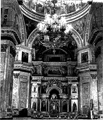 Исаакиевский собор. Центральный неф. Фотография. 1978. предложено расписать своды и аттик по концам большого нефа. П. Шамшину на тех же оводах — пять картин. Т. А. Маркову — тоже живопись на сводах и одна большая картина. В. П. Васину — роспись сводов и парусов над алтарями приделов св. Екатерины и св. Александра Невского. Ф. А- Риссу досталась роспись купольных сводов вправо и влево от главного входа. Художникам Т. А. Маркову, К. Штейбену, Плюшару, Н. М. Алексееву, Ф. С. Завьялову, В. К. Шебуеву, П. А. Нефу, Н. Никитину, Н. Муссини — роспись остальных частей храма. Наряду с первоклассными мастерами к огромной работе были привлечены менее значительные живописцы — Марков, Рисе и другие. Все это обусловило неравнозначность произведений. Художникам ставились жесткие условия, определявшие не только сюжет и композицию, но и определенный типаж. Условия были выработаны Монферраном с учетом требований Синода. Готовые эскизы оценивались комиссией из представителей Синода, Совета Академии художеств при участии Монферрана и санкционировались Николаем I. Вдохновляясь произведениями великих мастеров эпохи барокко, авторы росписей Исаакиевского собора должны были придерживаться требований Синода, соблюдая жесткие условия в отношении композиции, сюжета, типов. В композиционных построениях они придерживались принципа размещения фигур по диагонали, что создавало впечатление большей динамики масс, усиливало светотеневые и цветовые контрасты. Великому художнику Брюллову выпала самая ответственная и сложная задача — расписать плафон большого купола площадью семьсот двадцать квадратных метров. Она требовала знаний специфических принципов построения композиции, обозреваемой снизу. Работа над плафоном велась в трудных условиях, требовавших большого физического напряжения. Но именно сложность и трудность задачи привлекала Брюллова. Яркая выразительность образов росписей Исаакиевского собора была результатом не только таланта Брюллова-монументалиста, но и следствием его напряженной пятилетней работы над подготовительными этюдами и эскизами. Работа в сыром недостроенном соборе подорвала его здоровье: художник уехал в Италию, где в 1852 году скончался. Применяя различные новшества в украшении собора — гальванопластические скульптуры, мозаику, Монферран ввел и витраж, сделав запрестольный образ, изображающий Христа. Витраж сделан на Мюнхенской мануфактуре, отличается яркостью и глубиной цвета. Его изготовил выдающийся мастер-витражист М. Э. Айнмиллер. Богатство внутренней отделки собора завершают вызолоченные детали — литые бронзовые, с рельефным орнаментом базы и капители колонн, различные гальванопластичеокие украшения в виде медальонов, кессонов, гирлянд и т. п. Вызолоченные скульптуры и украшения помещены не только на вертикальных плоскостях, но и на сводах, создавая в сочетании с разноцветным, великолепно отполированным мрамором и живописью пышное и богатое убранство. Дополняют его ажурные золоченые люстры, серебряная и золоченая церковная утварь. Использование разнообразной отделки, предусмотренное Монферраном, должно было осуществляться с большим тактом и сдержанностью. Но «указания» царя и Синода привели к некоторой раздробленности композиции и к декоративной перегрузке. Используя самые разнообразные отделочные материа