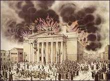 неизвестной причине в театре начался пожар. Пламя мгновенно охватило все