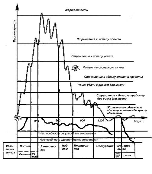 Видимо наиболее правильно объяснить ее как инерционную, возникающую время от времени вследствие "толчков", которыми могут быть только мутации, вернее микромутации, отражающиеся на стереотипе поведения, но не влияющие на фенотип. Как правило, мутация почти никогда не затрагивает всей популяции своего ареала. Мутируют только отдельные относительно немногочисленные особи, но этого может оказаться недостаточно для того, чтобы возникла новая консорция, которая при благоприятном стечении обстоятельств вырастает в этнос. Пассионарность членов консорции - обязательное условие этого перерастания. В этом механизме - биологический смысл этногенеза, но он не подменяет и не исключает социального смысла. Но перед нами встает другая трудность: еще не найдена мера, которой бы можно было определять величину пассионарности. На основании доступного нам фактического материала мы можем говорить только о тенденции к подъему или спаду, о большей или меньшей степени пассионарного напряжения. Однако для поставленной нами цели это препятствие преодолимо, ибо мы рассматриваем процессы, а не статистические величины. Поэтому мы можем описать явления этногенеза с достаточной степенью точности, что послужит в дальнейшем базой новых уточнений. Теперь перейдем к описанию. основных фаз того процесса, который отображает в общем виде приведенная нами кривая, и попытаемся показать, как происходит реально процесс постепенного расходования первичного заряда пассионарности. Мы уже говорили, что исходный момент любого этногенеза - специфическая мутация небольшого числа особей в географическом ареале. Такая мутация не затрагивает (или затрагивает незначительно) фенотип человека, однако существенно изменяет стереотип поведения людей. Но это изменение - опосредовано: воздействию подвергается, конечно, не само поведение, а генотип особи. Появившийся в генотипе вследствие мутации признак пассионарности обусловливает у особи повышенную по сравнению с нормальной ситуацией абсорбцию энергии из внешней среды. Вот этот-то избыток энергии и формирует новый стереотип поведения, цементирует новую системную целостность. Что же мы можем отметить для фазы подьема этногенеза? Общество (все равно из кого состоящее: будь то арабы, монголы, древние евреи, византийцы, франки) говорит человеку одно: "Будь тем, кем ты должен быть!" В этой иерархической системе, если ты король - будь королем, если ты министр - будь министром, если ты рыцарь - будь рыцарем и не вылезай никуда; исполняй свои функции, если ты слуга - будь слугой, если ты крестьянин - будь крестьянином, плати налог. Никуда не вылезай, потому что в этой крепко слаженной иерархической системе, составляющей консорцию, каждому человеку выделяется определенное место. Если они начнут бороться друг с другом за теплые места, а не преследовать одну общую цель, они погибнут. И если это случается, то они и гибнут, а в тех случаях, когда они выживают, действует этот же самый императив. Итак, вспышка пассионарности — обязательное условие начала этногенеза, но характеристики этого процесса различны. Они зависят от уровня техники, которая либо развивается, либо нет, если нет металлов и глины, как на островах Полинезии. Очень большое значение имеет первичная расстановка сил. Она может и сохраниться, и измениться. Культура наиболее