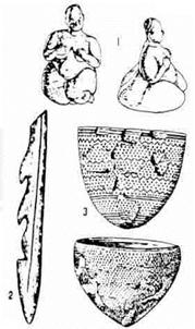 Культура в эпоху мезолита и неолита. Более поздние этапы развития первобытной культуры относятся к мезолиту, неолиту и ко времени распространения первых металлических орудий. От присвоения готовых продуктов природы первобытный человек постепенно переходит к более сложным формам труда, наряду с охотой и рыболовством начинает заниматься земледелием и скотоводством. В новом каменном веке появился первый искусственный материал, изобретенный человеком, - огнеупорная глина. Прежде люди использовали то, что давала природа, - камень, дерево, кость. Земледельцы гораздо реже, чем охотники, изображали животных, зато с увеличением украшали поверхность глиняных сосудов.