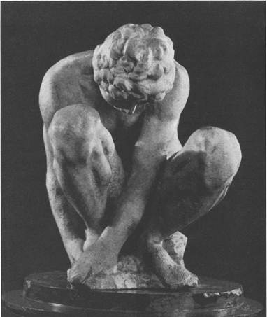 «Скорчившийся мальчик» — единственное подлинное произведение мастера в Советском Союзе — предназначался первоначально для украшения усыпальницы Медичи в церкви Сан Лоренцо. Работа над проектом началась еще в 1520 году, но закапчивал ее Микеланджело уже после падения Флоренции. В 1527 году войска императора Карла V разгромили Рим. Так окончилась длившаяся десятилетия борьба европейских стран за утверждение своего политического господства в Италии, оказавшейся теперь в сфере влияния империи Габсбургов. Когда во Флоренции стало известно о "Sacco di Roma" (разгроме Рима), в городе вспыхнуло восстание, и Медичи вновь, но ненадолго были изгнаны за пределы Флоренции. Однако папа Климент VII, сам происходивший из рода Медичи, пошел на сговор с Карлом V, и объединенными усилиями папских и императорских отрядов началась осада героической Флоренции. Город стойко сражался за свою независимость в течение одиннадцати месяцев, но эпидемия, голод, измена в рядах сторонников республики привели к тому, что в августе 1530 года Флоренция пала. Микеланджело был с теми, кто с оружием в руках сражался за свободу родного города. Падение Флоренции он пережил чрезвычайно остро. Это еще усугублялось тем, что своим искусством скульптор должен был прославлять тех тиранов, против которых выступал. И скорбь, царящая в капелле церкви Сан Лоренцо, — это не столько тоска по ушедшим из жизни герцогам Лоренцо и Джулиано, сколько тягостные раздумья о судьбе Флоренции, судьбе Италии. В гробнице Медичи архитектурное и скульптурное решение целиком принадлежит Микеланджело. Весь ансамбль как бы строится на гармонии диссонансов. Небольшое по размеру квадратное помещение устремляется ввысь почти с готической настойчивостью. Белый мрамор стен динамично расчленен при помощи темного камня системой арок, пилястров, капителей, наличников окон. И в цветовом решении — светлого и темного — есть что-то от сочетаний траурного флага. Отступая от вековой традиции, Микеланджело изображает ушедших из жизни герцогов не мертвыми, лежащими на своих саркофагах, а как живых людей. Их фигуры помещены в двух нишах, в то время как аллегории суток — Дня, Ночи, Вечера и Утра — покоятся на надгробиях. Тяжелые, скорбные, мощные, они олицетворяют идею губительного времени, беспощадно ведущего человека к могиле. Фигуры расположены на покатых крышках так, словно готовы соскользнуть с них. Сильные, конвульсирующие от внутреннего напряжения тела пересекают горизонтальную линию карниза, внося во всю композицию элемент беспокойства и скорби. Джулиано и Лоренцо устремляют взгляд к мадонне с младенцем, статуе, стоящей у третьей стены капеллы. Но Мария выступает не в обычной для нее роли заступницы. Здесь мадонна — воплощение неумолимости судьбы, она клонит очи долу, и в складках одежды на ее груди прячет свое лицо младенец Христос, наделенный геркулесовым телосложением. По первоначальному замыслу гробница должна была включать большое количество статуй. Об этом свидетельствуют эскизы Микеланджело, относящиеся к концу 1520-го — началу 1521 года. На одном из них (Лондон, Британский музей), кроме статуй суток у подножия саркофага, изображены еще аллегорические скульптуры, с каждой стороны по фигуре, а над филенками, декорирующими вверху пустые ниши (они фланкируют центральную), намечены согнувшиеся юноши. Из