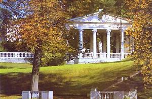 О В дни, когда императрица наблюдала за его возведением, колоннада была не такой как ныне. Чарльз Камерон задумал Святилище греческого бога в виде двойного кольца колонн дорического ордера, объединенных неканоническим антаблементом с триглифами и метопами, зофорным фризом ионического ордера с медальонами и гирляндами лавровых ветвей. В качестве строительного материала Камерон избрал пудостский камень. В центре Колоннады первоначально была установлена алебастровая копия статуи Аполлона Бельведерского. Первоначально Колоннада Аполлона находилась на большом живописном лугу верхнего плато левого берега Славянки, почти при въезде в парк. Позднее, около 1800 году, уже без участия Камерона её перенесли на берег Славянки против дворца. По проекту архитектора Кваренги от Колоннады Аполлона был устроен каскад, спадавший по каменным перекатам в реку. Теперь Колоннада, установленная на вершине берегового холма должна была напоминать Парнас – гору, где по греческой мифологии, обитали Аполлон и музы. Воды каскада олицетворяли чистый Кастальский ключ, стекающий с Парнаса, источник поэтического вдохновения. В 1817 году во время сильной грозы часть Колоннады со стороны дворца, подмытая водой каскада рухнула. Катастрофа придала сооружению характер романтической руины, ещё более усилив её поэтическую живописность. Случайность создала более, нежели самый утонченный вкус. Каждый восхищался этим романтическим видом, этим изящным разгромом. Было решено оставить Колоннаду в разрушенном состоянии, не восстанавливая рухнувших колонн. Пролом в кольце Колоннады открыл живописный вид на скульптуру Аполлона, которая была видна теперь из окон дворцовых зал. Холодная баня. (Холодная ванна) Это летняя мыльня, построенная Чарльзом Камероном в 1799 году на берегу реки Славянки. Холодная баня доказывала увлечение хозяев Павловска античным искусством. Древние римляне очень ответственно относились к созданию терм – бань, которые были настоящими культурными центрами. Состояли из трех основных помещений: фригидария – бассейна с холодной водой, тепидария – центрального помещения и кальдария – круглого бассейна с холодной водой. Павильон слился с окружающим пейзажем и хорошо виден лишь со стороны дворца, от мостика с кентаврами, четко вырисовываясь на фоне рощи. Этой небольшой постройке архитектор придал форму купольной ротонды, с прямоугольной пристройкой, завершенной фронтоном. Гладкие стены павильона украшены лишь двумя небольшими нишами для скульптуры. Простота замысла и хорошо найденные пропорции, несмотря на скромные масштабы и строгость архитектурного оформления, придают сооружению величавость, гармонирующую с интимным характером соседней Семейной рощи. Эта роща составлялась из деревьев, высаженных в честь рождения членов семьи Павла I. Внутри павильона имелось два помещения: раздевальня и круглый зал, центр которого занимал бассейн. Храм дружбы. Храм дружбы был задуман молодой Великокняжеской четой как ответный дар Императрице – матушке – в благодарность за подаренные земли. В 1779 году Чарльз Камерон приступил к разработке проекта. Сама идея постройки Храма дружбы не была новой. В европейских парках Кью и Стоуэ имелись прототипы; их основной архитектурный мотив – ротонда, окруженная колоннадой. Как писатели, пользуясь известными