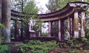 Д Один из первых районов парка, распланированных Камероном в пейзажном стиле. Извилистое русло реки и живописные холмистые берега дали возможность архитектору развернуть здесь свой блестящий талант паркостроителя. По береговым склонам живописно раскинулись куртины деревьев умело скомпонованных и тонко подобранных по форме кроны и цвету листьев. Серебристые ивы, посаженные у воды, склонившись, купают в ней свои гибкие ветви. Мощные раскидистые дубы «букеты» кустовых лип, и стройные березы широко разрослись на открытых зеленых склонах. Они подчеркивают перспективу развертывающихся пейзажей. В формировании пейзажей долины Славянки приняли участие почти все архитекторы, работавшие в Павловске. Придворцовый участок реки – Камерон (до Висконтьева моста), между Висконтьевым мостом и Пильбашенным мостами – Бренной, в Красной долине – Гонзаго. Хотя они работали в разное время, но всех их объединяет общая идея: как можно полнее выявить и раскрыть красоту русской природы. Архитектурные сооружения, введенные ими в пейзаж, стали композиционными центрами отдельных живописных участков парка. Павильон и сооружения выдержаны в характере античной архитектуры. Их классически совершенные формы, в сочетании с архитектурой дворца, создают единство художественного ансамбля. Колоннада Аполлона.