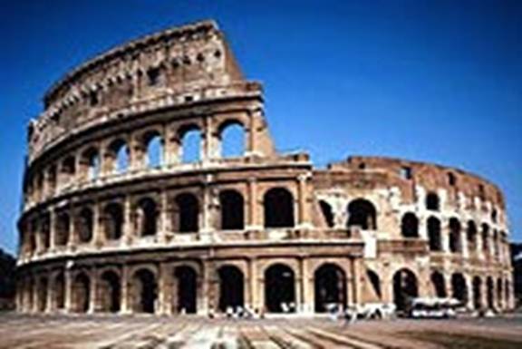 В первом веке до нашей эры полубезумный император Нерон приказал своим архитекторам, Северу и Целеру, построить для него дворец. Постройки дворца гордо названного “Золотым домом Нерона”, занимали склоны трех из семи Римских холмов: Целия, Опия и Палатина. Территория дворца была так велика что современники с горечью шутили тогда: “…римлянам остаётся только одно – переселиться в соседний Вейн”. Среди садов Нерон повелел поставить бронзовую фигуру высотой в 12-ти этажный дом. Это была статуя самого императора в позе прославленного Колосса Родосского. У ног гиганта Нерон приказал выкопать озеро и наполнить его солёной водой. Это было как бы море, возникшее по прихоти императора. Дом Нерона был отделан золотом и украшен драгоценными камнями и перламутром. Потолки столовых были покрыты обшивкой из слоновой кости, которая вращалась, чтобы можно было сверху через отверстия сыпать цветы, а сквозь трубки брызгать благовониями. Главная столовая была круглая; днём и ночью она непрерывно совершала круговое движение на подобие Вселенной. Во дворце находилась модель окружающего мира с городами, пашнями, садами, а над главным зданием дворца была сооружена вращающаяся сфера потолка с нарисованными звёздами. После самоубийства Нерона в 98 году император Веспасиан Флавий разрушил дворец, расплавил статую а на месте искусственного моря заложил фундамент гигантской эллиптической чаши, способной вмещать до 60 тыс. человек. Это сооружение должно было показать Риму, что новая династия Флавиев больше прежней заботиться о своих гражданах, и поэтому постройке было дано название “ амфитеатр Флавия “, но римляне зовут его Колизеем. О том, что здесь было искусственное озеро, напоминает лишь система каналов и шлюзов, позволяющая затопить арену за несколько минут. Своё название Колизей получил от латинского слова “colossus”, что означает “ великан “. Императоры Веспасиан и Тит, бывавшее на Востоке и находившееся под впечатлением от громадности и величия египетских пирамид, решили возвести амфитеатр, столь же величественный и грандиозный. Колизей имел форму удлиненного круга и стоял на 80-ти арках, над которыми поднимались арки меньшего размера. Двести сорок огромных арок в три яруса снаружи окружают колоссальный эллипс. За ним располагались сводчатые галереи – места отдыха зрителей и бойкой торговли. На первый взгляд, арок так много, как сот в улье, но при этом однообразия нет. Каждая арка оказывается под другим углом и к солнцу, и к зрителю, на арки по- разному падают тени. Они однородны, но не ординарны. Снаружи амфитеатр был облицован мрамором и украшен статуями, внутри поднимались 80 рядов зрительских мест, 64 огромных входа впускали в амфитеатр толпу. В нижней части здания располагались места для римских вельмож и трон для императора под высоким балдахином. Потолка не было. Хитроумная система канатов и блоков позволяла натягивать на мачтах парусиновый тент, защищавший зрителей от дождя и палящего солнца. В первом ярусе стояли полу колонны дорические (отдалённо напоминающие Парфенон), во втором ярусе – ионические (немного похожие на Эрехтейон), на третьем ярусе – коринфские с кудрявыми, украшенными листвой капителями. О происхождении коринфских колон древняя легенда рассказывает так. …В городе Коринфе жила молодая и прекрасная девушка. Она был
