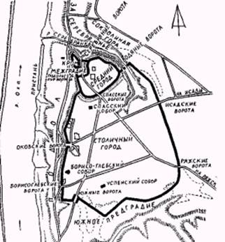 Рис.1.План Рязани начала XIII в. протекает Серебрянка, на юге- Черная речка. С восточной, напольной, сто- роны, не имевшей естественных рубежей, создается мощная система укреплений. Столичный город, окруженный стенами, занял площадь около 55-57 га, а в целом с Кромом и Средним городом — свыше 60 га (рис.1). Судя по незастроенным участкам, он был явно открыт для дальнейшего заселения, которое прервало нашествие монголов. В новом планировочном образовании первоначальные крепости оказались на периферии. Они не стали композиционным центром стольного града, который перемещается в юго-западную часть Южного городища. Один из главных структуроформирующих элементов плана (пояс укреплений) представляет собой тщательно продуманную целостную систему. Приглашенные князем «градодельцы» скорее всего использовали метод предварительного проектирования, предусматривающий создание нескольких самостоятельных архитектурных узлов в планировочной структуре. Внешний облик Рязани, парадным фасадом обращенной к Оке, преобразился: подчинение сложному рельефу, контраст вертикалей церквей, теремных строений, башен и массовой застройки вели к разнообразию силуэтов города с разных точек, многоплановости и ярусности его композиции живописности и пластике архитектурных ансамблей. Главным архитектурным узлом стал ансамбль большой площади фланкированной Успенским и Борисоглебским соборами, возможно, возведенными на месте деревянных церквей. Успенский собор возвели на слабо выраженной бровке, на переломе от плоского к покатому микрорельефу. Его продольная ось ориентирована на Южные ворота, от которых шла прямая дорога к храму, проложенная по дамбочке высотой до 0,5 м. Эта дамбочка следы которой удалось выявить при раскопках, обеспечивала путь посуху от ворот к церкви. Благодаря естественному наклону участка к югу, входящему в город через Южные ворота, казалось, что собор словно парит на фоне неба. Также воспринимался и Борисоглебский собор на крутом окском косогоре, к которому также шла дорожка по насыпи. Из южного притвора храма выходили к Борисоглебским воротам, откуда по пандусу спускались на Подол. Портал западного притвора выходил к оборонительной стене. По всей вероятности, после 1198 г. близ собора находился двор епископа со службами. Там же открыты дворцовые строения "княжьих мужей". Другой важный архитектурный узел — квартал вокруг Спасского собора в северной части "набережной", куда в конце XII в. перенесли княжескую резиденцию. Оба ансамбля были связаны улицей, которая от Южных ворот шла в северном направлении через Вечевую ("Соборную") площадь и, минуя Спасскую церковь, — к Спасским воротам. Здесь она сливалась с основной городской магистралью — Большой (Великой) улицей, проложенной с Подола от устья Серебрянки и через Серебряные и Спасские ворота выводившей к Ряжским (Пронским). Можно сказать, что существующая до сих нор грунтовая дорога, соединявшая в ХII- XIII вв. сельские поселения к югу от Рязани вплоть до Ново-Ольгова городка, вела в Пронское Поречье. Проем на месте древних ворот был разрушен оврагом (Старые Пронские ворота), после чего, по-видимому в ХVIII в., сделали новый широкий разрез в валу, так называемые Новые Пронские ворота. Столичный город обладал развитой уличной сетью. Главные внутригородские магистрали-проезды, выйдя из ворот, пер