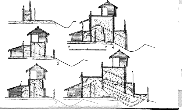 Рис.2 Развитие оборонительной стены: 1- первая стена Столичного города (около середины XII века.); 2- стена второго периода; 3- третий этап. Стена становится выше, спереди появляется подпорная стенка; 4- стена, уничтоженная Всеволодом III в 1208 году; 5- стена, сожженная Батыем в 1237 году. Примерно на рубеже XII – XIII веков произошла коренная перестройка укреплений: стена приобрела монументальный характер при разнообразии архитектурных объёмов. В 1208 году именно она была сожжена Всеволодом III. Засыпка городен стены третьего периода затекла в старый ров. Общая высота стены достигла 7 метров. Для ослабления распора её засыпанного массива с напольной стороны, где проходил ров, синхронный второму и третьему этапам, прирубили дополнительную линию городен. Таким образом, со стороны поля «стена градская» превратилась в двухъярусную, с тыном на нижнем и с заборолами-облами на верхнем ярусе (рис.2). По восстановлении после пожара укрепления пятого строительного периода, которые штурмовали войска Батыя, стали ещё более мощными. С напольной стороны образовалось несколько линий обороны: стена стала трехъярусной, высотой свыше 10 метров. Самая высокая часть стены, состоявшая из полотно забитых землёй городней с боевыми площадками типа обламов, выдвинулась ещё дальше в сторону поля (рис.2). Как и на четвёртом этапе, кроме заполненных грунтом четырехстенных клетей-городней в основном массиве стены, широко применили систему «тарасов» – конструкций из связанных между собой трех стенных срубов. Тарасы (термин XVI - XVII веков) использовали для прикладки к готовой стене, наращивая её и расширяя. Тарасы для жесткости связывали перерубами со стеной, и так же, как и городни, засыпали землёй, что превращало все фортификационные членения в монолит. Прирубы с обеих сторон, подобно контрфорсам, погашали распор стены. Кроме того, внутренний ярус служил для скрытного перемещения защитников и, судя по разрезу вала в верхней части, эту дорожку для прочности вымостили битым белым камнем и кирпичом. Внутри засыпки этого яруса оказались части ранее уничтоженных укреплений. Узкая подпорная ступень с тыном поверху служила дополнительной преградой с напольной стороны. Крупные города, подобные Рязани, помимо стен и тына перед ними, моли иметь и ограду перед рвом в виде надолб -–заостренных кольев, связанных между собой прогонами – «наметными слегами». Надолбы были простые, двойные, тройные и напоминали разреженный частокол. Они препятствовали подходу к городу конницы со стороны поля. Мощная стена, противостоящая стенобитным орудиям, состояла из основного объёма и примыкавших к ней и также заполненных плотной глиной оплотов – «опалубок». Чтобы «поставить город» после разорения Всеволодом потребовались дополнительные земляные работы огромного размаха. При выемке грунта для засыпки деревянных конструкций образовался ров, существующий поныне, а старый окончательно исчез под осыпями от предыдущих укреплений. Возможно, для увеличения крутизны откосов рвов их обкладывали деревом, как это имело место в позднейшем крепостном зодчестве. Первоначально простая стена из городен с частоколом наверху, постепенно превращается в мощное фортификационное сооружение с трех стенными срубами – контрфорсами, осадными клетями с тыльной стороны, заборолами наверху для защитников и двумя 