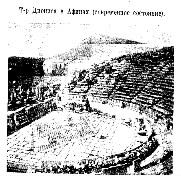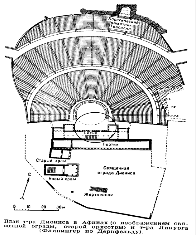 ___________ * Орхестра - от глагола орхеомай - танцую. ** Тэатрон - места для зрителей. *** Скена - палатка, позже деревянное строение. **** Театральная энциклопедия , т. 2, стр. 534. ***** Колпинский Ю.Д., Великое наследие античной Элады., стр. 134. ПОСТОНОВАЧНАЯ ТЕХНИКА ТЕАТРА Развитие драматургии определяло эволюцию постановочной техники греческого театра. В ранних трагедиях Эсхила декорации представляли собой массивные деревянные сооружения (большой алтарь с кумирами двенадцати богов в «Умоляющих», гробница царя Дария в «Персах», скала в «Прикованном Прометее»). При Софокле появились расписные декорации, помогавшие превращать проскений в фасад дворца или храма, в переднюю стену палатки предводителя. В некоторых комедиях действие переносилось из одного месте в другое (например, из города в деревню, с земли в подземное царство и т. д.), причём в театре они располагались рядом. Содержание греческой драмы требовало применения театральных машин. “Божества взлетали вверх и спускались вниз спомощью блоков, причем от зрителей ничего не скрывалось и всегда были видны веревка и крюк, которым зацепляли за пояс “парящего в воздухе” актера. Существовало в древности латинское выражение Deus ex machina (бог из машины). С помощью этих машин на сцену являлось божество и легко разрешало чересчур усложнившиеся взаимотношения действующих лиц.”* Наиболее употребительными были: эккиклема** (в трагедиях, обычно сцены убийства), эорема***. ___________ * В. Барбич Г. Плетнева ., Зрелища Древнего мира, стр. 16. ** Эккиклема - выдвижная площадка на низких колёсах, показывавшая зрителям, что происходит или произошло внутри помещения. *** Зорема - приспособление, позволявшее богам и др. действующим .лицам подниматься в воздух и опускаться. ВИДЫ ДРЕВНЕГРЕЧЕСКИХ ТЕАТРОВ: ТЕАТР КЛАССИЧЕСКОЙ ЭПОХИ ТЕАТР ДИОНИСА В АФИНАХ Древнейшим из известных театральных зданий является театр Диониса в Афинах, расположенный в священной ограде Диониса на юго-восточном склоне Акрополя в последующие эпохи несколько раз перестраивавшийся. Его раскопки были завершены в 1895 г. Дёрпфельдом. По двум незначительным остаткам стены Дёрнфельд установил круглую орхестру — террасу с диаметром 27 м. (Э. Фихтер считает диаметр этой орхестры равным приблизительно 20 м). Она была расположена на склоне Акрополя таким образом, что её северная часть вдавалась в гору, а южная — подпиралась стеной, поднимавшейся в самой южной части на 2-3 м над уровнем священной ограды Диониса и на западе вплотную соприкасавшейся с старым храмом. Никаких каменных сидений в этом театре еще не было: зрители сидели на деревянных скамьях, а, может быть, на первых нарах и просто стояли. Византийский учёный Свида сообщает, что в 70-ю олимпиаду (т. е. в 499—496 до и. э.) временные сидения обрушились и что после этого афиняне соорудили театрон, т. е. особые места для зрителей. Скена вначале не обозначала дворца или храма. Однако более поздние пьесы Эсхила и драмы Софокла уже требовали в качестве задника дворца или храма, и на касательной орхестры стали сооружать деревянное здание скены, на фасаде которого вскоре появились 3 двери. В это же время входит в обиход и сценическая живопись, причём расписные доски могли расставляться между колоннами проскения. При Перикле театр подвергся перестройке, закончившейся, вероятно, после его смерти. Старая орхестра была отодви