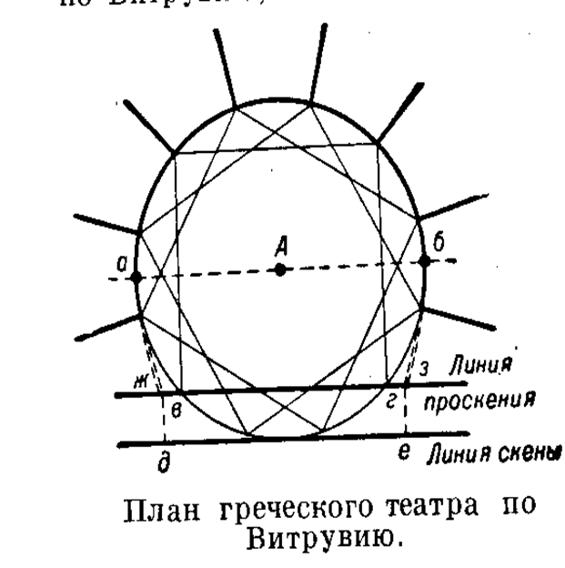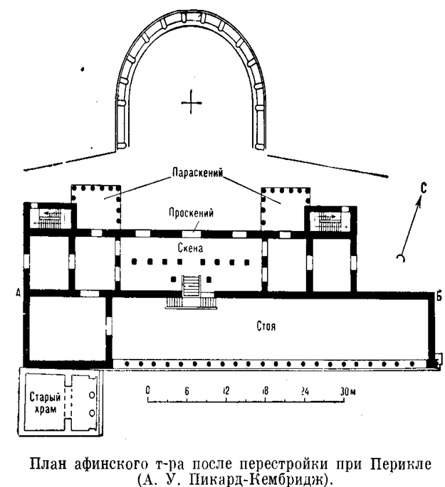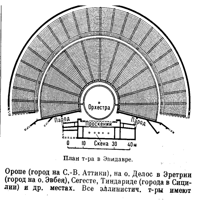 АРХИТЕКТУРА ДРЕВНЕГРЕЧЕСКОГО ТЕАТРА Народный характер античного театра определил особенности его организации и устройства. Древнегреческий театр сооружался на открытом воздухе и состоял из 3-х основных частей: орхестры* ,тэатрона** и скены***. Древнейшей из этих частей является орхестра — круглая площадка, на которой выступали хор и актёры. Вначале зрители свободно размещались вокруг орхестры. Позднее появились особые места для публики, расположенные на склонах прилегающих холмов и гор. Античный театр вмещал огромное количество зрителей (Афинский театр, например до 17 тыс. чел.). Скена, первоначально предназначавшаяся только для переодевания и выходов актёров, находилась вне круга орхестры, позже уже на касательной к его окружности. Передняя стена скены - проскений,имевшей обычно вид колонады, изображая фасад храма или дворца, приобрела со временем большое значение в оформлении спектакля.”Так как в трагедии действие почти всегда происходило перед дворцом или храмом, то, по мнению немецкого архитектора и археолога В. Дёрпфельда, проскений обычно имел вид колоннады или портика; эта колоннада проходила либо вдоль всего фасада скены, либо занимала только её центральную часть.”**** На обоих концах здания скены были пристроены (возможно, уже в 1-й пол. 5 в. до н.э.) два боковых строения, которые назывались параскениями. Параскении служили, по-видимому, местом хранения декораций и другого театрального имущества; в тех случаях, когда драма требовала наличия двух или трёх жилищ, параскении могли изображать эти жилища. Между скеной и местами для зрителей, занимавшими несколько более половины круга, находились проходы - пароды , через которые вступали на орхестру хор и актёры, по ходу пьесы прибывавшие из города, гавани или из чужой страны. В V и IV вв. до н.э. греческие актёры играли на орхестре перед проскением. Никакой высокой или низкой сценической площадки в это время не существовало. Планировка греческого театра была рассчитана на хорошую слышимость. Кроме того, для усиления звука в некоторых театрах применялись резонирующие сосуды, помещавшиеся среди зрительных мест.”Если, стоя в центре орхестры, бросить на камень пола монетку или разорвать клочок бумаги, то звон упавшей монеты, шорох разрываемого листа будут слышны в самом вверхнем ряду.”***** Занавеса в греческом театре не было, хотя возможно, что в некоторых пьесах какие-либо части проскения временно занавешивались от зрителя.