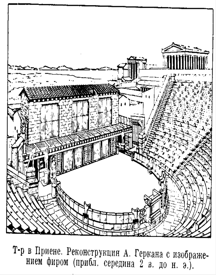 ТЕАТР В ПРИЕНЕ Театр был построен между 350 и 330 до н. э. (немецкий учёный А.Геркан указывает 300 до н.э.). Вначале скена была деревянной. Каменная скена была выстроена не раньше начала 3 в. до н.э. Она представляла собой двухэтажное строение с одноэтажным зданием спереди, выходящим на орхестру. Плоская крыша этого более ниакого здания состояла из деревянных досок, помещенных между каменными балками. Передняя стена состояла из каменных полуколонн, прислонённых к опорным столбам. Так как имелись отверстия по бокам опор, то, очевидно, к ним могли быть прикреплены деревянные панели. Следовательно, колонны представляли собой постоянную декорацию, а расписанные доски между ними — меняющуюся декорацию. По мнению А.Геркана, верхний этаж над плоской крышей был сперва закрыт за исключением одной двери. Существование только одной двери для выхода на крышу проскения, а также наличие приспособлений для укрепления декораций между колонами проскения заставляют сделать вывод, что действие развивалось вначале перед проскением. Однако приблизительно к середине II в. до н. э. действие было перенесено на крышу проскения, на логейон. Это вытекает из некоторых изменений, произведенных в театральном здании: места для почётных гостей были отнесены из первого ряда зрительских мест в пятый, в фасаде скены на 2-м этаже появились широкие фиромы, на орхестре перед проскением были поставлены статуи.