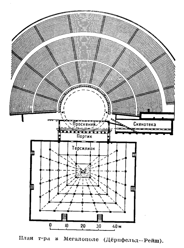 ТЕАТР В ПЕРГАМЕ. Пергам — столица эллинистического Пергамского царства в Малой Азии (создано в 283 до н. э. Филетером), перешедшего в 133 до н.э. к римлянам и превращённого ими в провинцию Азию. Театр был построен на склоне путей горы в узкой лощине (узость использованной лощины объясняет то обстоятельство, что число лестниц, идущих вверх, уменьшается, вместо того чтобы увеличиваться). 2 поперечных прохода разделяют зрительские места на 3 яруса. Скена и проскений были сделаны из дерева. Если в классическую эпоху это было правилом, то в эллннистическую эпоху скена и проскений сооружались почти всегда из камня, деревянные конструкции там, где они имелись, были заменены, вероятно, еще в 3 в. до н.э. каменными. Таким образом, Пергамский театр один сохранял значительные остатки деревянной конструкции от 2 в. до н. э. В позднее эллинистическое время (1 в. до н.э.) в Пергаме была сооружена каменная скена. В римское время перед фасадом скены соорудили низкую глубокую сцену, которая стоит на стилобате эллинистического проскения. От обоих концов сцены высотой в 1 м вели на орхестру рядом с пародами лестницы с 5 ступеньками.