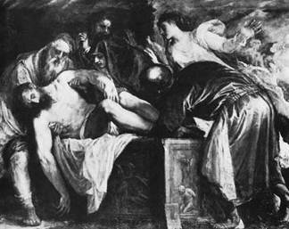 Первая встреча с античностью и римским искусством глубоко повлияли на него, об этом пишет почти пятидесятилетний Тициан императору, а позднее - художнику Леоне Леони. Впечатления от поездки в Рим обогатили и вдохновляли его, но не изменяли его стиля. С 1552 года Тициан снова живет в Венеции. За время его многолетнего отсутствия здесь многое изменилось. На подъеме находилось молодое поколение художников, во главе его - Якопо Тинторетто[23] и Паоло Веронезе[24]. Первый художник города все еще пользоваться большим почетом, но многие интересные заказы получали более молодые. После отречения от престола императора Карла V, его сын, Филипп II Испанский, становится самым влиятельным заказчиком и покровителем Тициана. В последующее время художник пишет для него несколько вариантов темы Венеры и Данаи. Серии мифологических сцен были посланы испанскому королю, известному религиозному фанатику. За четвертым творческим десятилетием, которое истощило внутренние силы художника, вновь следует время расслабленности, как и в тридцатые годы, он посвящает себя главным образом прославлению женской красоты. После 1560 года на передний план все сильнее выступают религиозные темы. На это повлияли изменившиеся взгляды самого Тициана. С 1556 года Аретино[25] не стало в живых, ему не доставало и многих других друзей его поколения. Многие поклонники его искусства не понимали позднего стиля художника, все громче становились сомнения в его необычной технике. Еще в 1568 году мастерская Тициана работала полным ходом, источники сообщают о серийных поставках картин. Как и в ранние годы, мастерскую покидали повторения и копии, которые в значительной мере зависели от спроса. Среди них были повторения полюбившихся мифологических и религиозных сцен, а также портреты великих людей. Сегодня трудно судить, насколько мастер сам контролировал эти работы, всегда ли он прилагал к ним свою руку. В 1574 году Тициан привел в порядок свои деловые отношения с испанским двором и позаботился о будущем своего сына Орацио. Вероятно смерть Сансовино, умершего четыре года до этого, заставила осознать его свой собственный возраст. Во время зверствующей в Венеции в 1575/76 годах ужасной эпидемии чумы угасла 27 августа 1576 года жизнь Тициана. Умер ли он от чумы, как несколько позднее Орацио, его сын, достоверно неизвестно. Он не был похоронен с необходимой в таком случае поспешностью. На следующий день после кончины с торжественной церемонией Тициан был погребен в капелле Распятия в церкви Санта Мария деи Фрари, для которой была предназначена картина «Оплакивание Христа», его последнее незаконченное произведение.
