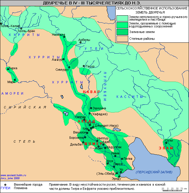Небольшие деревни располагались довольно далеко от воды, так как Евфрат разливается летом очень бурно и неожиданно, и наводнения всегда здесь были очень опасны. В бескрайние тростниковые заросли люди старались не заходить, хотя под ними скрывались очень плодородные земли. Они образовались из ила, оседавшего вовремя наводнений. Но в те времена обработка этих земель была еще людям не под силу. Они умели снимать урожаи только с небольших открытых участков, напоминавших своими размерами скорее огороды, а не поля. Все изменилось, когда в стране рек и болот появились новые, энергичные хозяева – шумеры. Кроме плодородных, но еще не освоенных земель новая родина шумеров могла похвастаться большим количеством глины и тростника. Ни высоких деревьев, ни пригодного для строительства камня, ни руд, из которых можно выплавлять металлы, здесь не было. Шумеры научились строить дома из глиняных кирпичей; крыши этих домов настилались из тростника. Такой дом нужно было каждый год подправлять, подмазывая стены глиной, чтобы он не разваливался. Заброшенные дома постепенно превращались в бесформенные холмы, так как кирпичи были сделаны из необожженной глины. Шумеры часто оставляли свои дома, когда Евфрат менял свое русло, и поселение оказывалось далеко от берега. Глины повсюду было много, и за пару лет шумеры успевали слепить новый поселок на берегу кормившей их реки. Для ловли рыбы и речных путешествий шумеры использовали плетеные из тростника небольшие круглые лодки, обмазывая их снаружи смолой. Обладая плодородными землями, шумеры со временем поняли, какие высокие урожаи можно получать, если осушить болота и провести воду к сухим участкам. Небогат растительный мир Двуречья, шумеры же акклиматизировали зерновые злаки, ячмень и пшеницу.Орошение полей в Междуречье было сложным делом. Когда по каналам поступало слишком много воды, она просачивалась под землю и соединялась с подземными грунтовыми водами, а они в Междуречье соленые. В результате снова соль вместе с водой выносилась на поверхность полей, и они быстро портились; пшеница на таких землях вообще не росла, да и рожь с ячменем давали невысокие урожаи . Шумеры далеко не сразу научились определять, сколько воды нужно для правильного полива полей: излишек или недостаток влаги были одинаково плохи. Поэтому задачей первых общин, образовавшихся на территории южной части Месопотамии, было устройство целой сети искусственного орошения. Ф.Энгельс писал: “Первое условие земледелия здесь — это искусственное орошение, а оно является делом либо общин, либо провинций, либо центрального правительства”. Организация больших оросительных работ, развитие древнейшей меновой торговли с соседними странами и постоянные войны требовали централизации государственного управления. В документах времени существования шумерийских и аккадских государств упоминаются самые разнообразные оросительные работы, как, например, регулирование разлива рек и каналов, исправление повреждении, причиненных наводнением, Укрепление берегов, наполнение водоёмов, регулирование орошения полей и различные земляные работы, связанные с орошением полей. Остатки древних каналов шумерийской эпохи хранились до настоящего времени в некоторых районах Южной Месопотамии, например, в области древней Уммы (современная Джоха). С