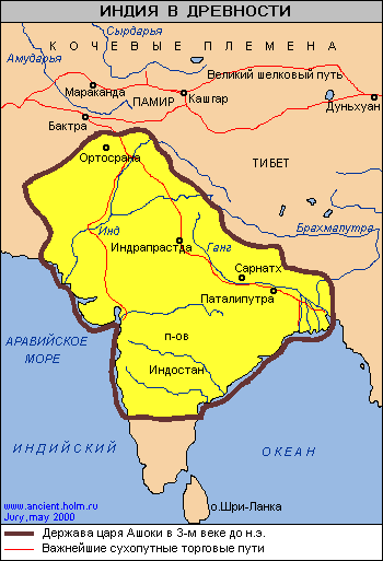 Г Западная часть Северной Индии — это Пенджаб (Пятиречье) — долина реки Инд и пяти крупных рек, которые сливаются и общим потоком впадают в Инд. Поскольку климат здесь засушливый, существовала необходимость в орошении. Районы, лежащие в бассейнах рек, впадающих в Инд, могли орошаться водами речных разливов. Родиной земледелия был Восток, и отсюда земледельцы расселялись во все стороны света, разнося вместе с драгоценными семенами свою культуру. Почувствовав нехватку земли, новые поколения шли осваивать дальние поля за линией горизонта, шли на запад и на восток - потому что восточнее Востока тоже были земли, реки и горы! Там, на другом краю света, располагались другие миры, почти что неведомые людям Запада, загадочные миры Индии и Китая. Об этих мирах ходили легенды, где сказочное переплеталось с реальным. Легенды говорили, что в Индии вечное лето, что там растут огромные деревья с листьями в щит воина, что гигантские слоны вырывают эти деревья с корнем, что они могут встать передними ногами на крепостную стену и раскачивать хоботом башни. Говорили, что два летних месяца там идут ливни и грозы, страну затопляют потоки воды, и, спасаясь от потопа, десятки змей заползают в дома - так что людям приходится уходить из своих жилищ. Рассказывали, что там так тепло, что люди могут ходить нагими и жить под деревьями - как во времена райской жизни; что повсюду растут благовонные травы, воздух наполнен ароматом и, наверное, где-то там, поблизости, расположен рай. Должно быть, первые земледельцы действительно приняли эту страну за рай; они пришли из выжженных степей Средней Азии, преодолели покрытые снегом горы и в VI тысячелетии вступили на благодатные берега Инда. Полупустынные ныне области северо-запада в глубокой древности, возможно, были покрыты лесами. Почвы аллювиальных долин Инда и его притоков отличались особым плодородием, так как эти почвы образовывались из речного ила. Здесь и возникли первые поселения земледельцев, а в III тыс. до н.э. - древнейшая в Южной Азии городская цивилизация. С севера и северо-востока Индия отделена от остальной части Азии хребтами Гималайских гор, поэтому именно северо-запад был той областью, через которую проникали переселенцы и завоеватели, шли торговые караваны, распространялись иноземные культурные влияния. Дальше на юго-восток начиналась страна джунглей, там бродили редкие охотничьи племена и царил еще каменный век, там не было больших поселений и лишь маленькие деревни колонистов постепенно продвигались в глубь тропического леса. Освоение джунглей было трудным делом: только сильная родовая община могла расчистить участок влажной, переплетенной лианами чащи. Такие общины вместе возделывали землю и поровну делили урожай между сородичами: они жили так же, как древние охотники, которых нужда приучила к равенству и братству. Сопротивление джунглей затрудняло продвижение земледельцев на юг и поначалу люди теснились в долине Инда; здесь вырастали города, дворцы и могучие крепости. Только вначале I тыс. до н.э., освоив технику добычи и обработки железа, индийцы стали вырубать джунгли и осушать болота. Ценой огромного труда на протяжении многих веков люди осваивали долину Ганга. Открытие культуры долины Инда произошло сравнительно недавно (с 20-х годов нашего века), и по разным причинам известна она хуже, чем 