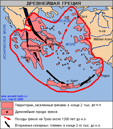 Крит представляет собой узкий остров, расположенный почти на равном расстоянии от Европы, Азии и Африки. Остров длинной в 250 и шириной от 12 до 57 км. Почти весь остров покрыт горными хребтами и их отрогами, доступными только пешеходам и вьючным животным. Небольшая плодородная равнина имеется лишь на юге центральной части острова. Заселение Крита началось со времён неолита, но тесные связи между жителями различных районов устанавливаются только в конце раннеминойского периода. Вплоть до середины II тысячелетия Крит не знал вторжений иноземных племен, и минойская культура, насколько можно судить по имеющимся данным, на протяжении примерно полутора тысяч лет развивалась самостоятельно. На острове появилась даже собственная, сугубо местного происхождения письменность. Но внешние связи, несомненно, существовали и оказывали известное воздействие на развитие культуры древнейшего Крита. Основным занятием жителей были рыбная ловля, скотоводство и частично земледелие. В течение восьми веков, охватывающих раннеминойский период, на Крите постепенно распространяется употребление металлов, в основном меди. Местные жители в то время пользовались медными кинжалами, топорами, ножами. Применение металлических орудий повлекло за собой улучшение техники обработки каменных сосудов и развитие других отраслей ремесла. Значительную эволюцию прошло гончарное дело. В первой половине II тысячелетия экономическое и социальное развитие Крита продвинулось далеко вперёд. Характерной чертой этого времени является распространение бронзы. Широкое применение бронзы отрыло путь к общему подъему производства. Развивается строительство крупных зданий, иногда в несколько этажей. Возникают первые дворцы в Кноссе, Фесте и Маллии. Царский дворец в Кноссе имел грандиозные размеры и сложный комплекс жилых и хозяйственных помещений. Значительный рост производительных сил наряду с усилением имущественного неравенства даёт основание полагать, что именно в среднеминойский период критское общество, по крайней мере, в ведущих, “дворцовых”, центрах, становится обществом классовым. Отсутствие сколько-нибудь значительного количества ввозных вещей указывает на то, что первые критские государства, несомненно, возникли вследствие постепенного внутреннего социально-экономического развития общества Крита, а не в результате какого-либо внешнего воздействия. Минойская держава находилась в зените своего могущества, когда силы ее неожиданно оказались подорванными вулканической катастрофой, за которой последовало вторжение на Крит около 1450 г. до н.э. многочисленных пришельцев с близлежащего материка. Крит имеет большую социальную значимость не только в силу исторических причин как центр минойской цивилизации, но и в силу причин географических. Крит являлся самым большим островом Эгейского архипелага и лежал на пересечении важнейших морских путей эллинского мира. Каждое судно, идущее из Пирея в Сицилию, проходило между Критом и Лаконией, а суда, идущие из Пирея в Египет, неизбежно проплывали между Критом и Родосом. Примерно в 19 в. до н.э. в центральную Грецию и на Пелопоннес началось вторжение индоевропейских племен с севера. Пришельцы – ахейцы, эолийцы, ионийцы и, наконец, ок. 1100 до н.э. дорийцы – говорили на разных диалектах греческого языка. В 16 в. до н.э. в 