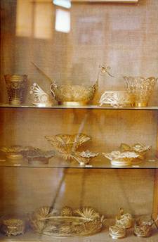 В этом разделе музея , кроме филиграни , так же представлены образцы изделий, сделанных в технике холодной и горячей эмали, их объединяет сходная техника производства . Из уплощенной медной проволоки * скани* скручеваются элементы орнамента геометрической или растительной формы, затем все это приклеивается или припаевается на медной , золотой, серебряной и ,в редких случаях ,латунной основе фоне. В случае с горячей эмалью процесс продолжается, на подготовленный фон накладывается эмаль легкоплавкое стекло и обжигается в печах при высоких температурах. 7.