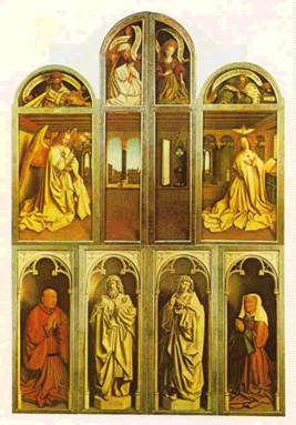 Сохранилось немного произведений прославленного художника, но каждое из них представляет собой выдающееся явление в живописи. Многие картины датированы и подписаны характерным девизом ван Эйка: «Als ixh xan» («Как умею»). Главным произведением Яна ван Эйка, безусловно, следует признать знаменитый Гентский алтарь, многостворчатый складень, находящийся в капелле св. Иоанна собора св. Бавона в Генте. В мае 1432 года алтарь был показан собравшимся и с тех пор является целью паломничества художников и любителей искусства. На внешних его створках изображены пророки и сивиллы, сцена Благовещения, святые Иоанн Креститель и Иоанн Богослов, заказчики алтаря Иосс Вейдт и Изабелла Борлют. Образы донаторов созданы с редкой жизненностью и пластической осязаемостью. Их фигуры более материальны, нежели другие, в образах этих гентских бюргеров выражен пафос живой конкретной реальности во всем ее убедительном правдоподобии. Ван Эйк демонстрирует мастерство иллюзорной передачи объемов и фактур каменных статуй Иоаннов, красоту драпировок в одеждах архангела Гавриила и мадонны, светящихся поверхностей медных кувшина и таза, глади белого полотенца, предметов, символизирующих чистоту девы Марии. Свет у ван Эйка означает акт божественного присутствия, но трактуется как вполне реальное явление, более того, художник имитирует как бы физическое его проникновение извне и пишет тени, будто бы отбрасываемые внутрь алтаря рамами его створок. Общая тональность внешних створок приглушена, таит в себе элемент таинственного ожидания, недосказанности. В праздничные дни алтарь открывался, достигая в ширину пяти метров, поражая великолепием колорита. Верхний ряд изображений начинается с центрального торжественного образа бога Саваофа, благословляющего все сущее, по сторонам его слева и справа читающая Мария и проповедующий Иоанн Креститель, затем по бокам стоят поющие и музицирующие ангелы, возносящие хвалу творцу, а по краям — Адам и Ева. Нагие тела прародителей человечества нарисованы явно с натуры, особенно это касается фигуры Адама. Нахождение их рядом с высшими персонажами христианской религии означало новое отношение к человеку в эпоху Возрождения. Нижние пять створок посвящены прославлению искупительной жертвы Христа, символом которой является стоящий на алтаре белый агнец. К нему собираются толпы людей, святые и праведники, мужчины и женщины, как бы все человечество. Религиозное единение оборачивается сплоченностью и братством, духовной общностью всех народов на дивной мирной земле, благоухающей великим множеством цветущих деревьев и трав, осененной ясным голубым небом, залитой светом лучезарного солнца. Чувство гармонии вселенной и человека выражено также в легко обозримой композиции, особенно же в сияющей радостной звонкости красок. Мир ликующей красоты открывается глазам зрителя. В нем каждая малость драгоценна и необходима. Используя прозрачность масляных красок, ван Эйк добивается исключительных эффектов сияния поверхности изображения и правдивой точности воспроизведения формы. Лессировки увеличивают глубину цвета, его силу. Главный цветовой аккорд живописной системы алтаря состоит из пламенного красного, синего и зеленого цветов, сосредоточенных в одеждах Саваофа, Марии и Иоанна, Благодаря реалистическим приемам Гентски