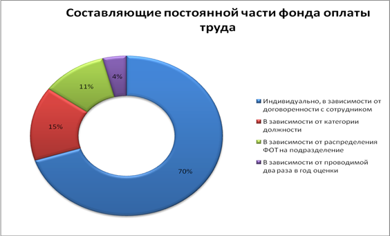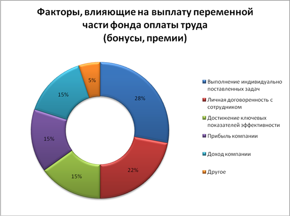 Приложение 1.1 (Факторы, влияющие на выплату переменной части фонда оплаты труда) Факторы, влияющие на выплату переменной части фонда оплаты труда (бонусы, премии)[19] Показан процент компаний, формирующих постоянную часть фонда оплаты труда на основании каждого фактора ü Выполнение индивидуально поставленных задач –– 28% ü Личная договоренность с сотрудником –– 22% ü Достижение ключевых показателей эффективности –– 15% ü Прибыль компании –– 15% ü Доход компании –– 15% ü Другое –– 5%