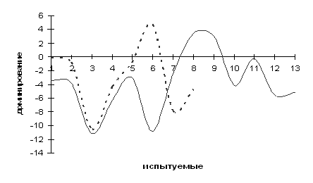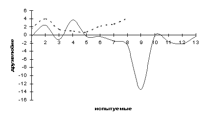 Опираясь на данные таблицы видно, что средние показатели дружелюбия и доминирования в группе 1 имеют более высокую степень проявления в положительном значении, чем показатели группы 2, у которой они имеют отрицательную выраженность. Это подтверждает выдвинутое ранее предположение о наличии дружелюбной направленности индивидуумов группы 1 и достаточно низких показателях данной направленности в группе 2. Для наглядного сравнения показатели уровня доминирования и дружелюбия в группах представлены в виде графиков (рис. 3 и 4). На графике показателей доминирования (рис. 3), хорошо видно, что в целом, по обеим группам оно не имеет какого-либо значительно выраженного характера. Так на каждую группу в среднем приходится 1-2 человека с преобладание направленности на доминирование, у прочих она не прослеживается.