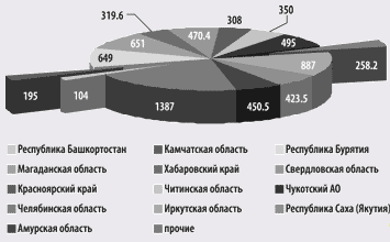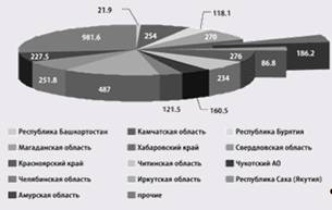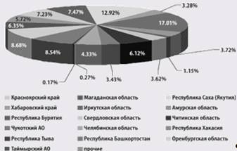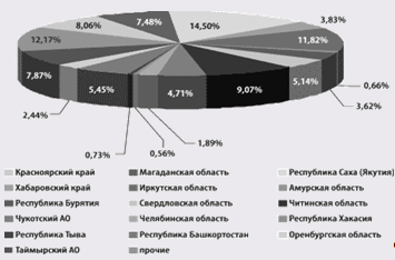 Рис. 3. Распределение разведанных запасов золота категорий В+С1 по субъектам РФ, %.