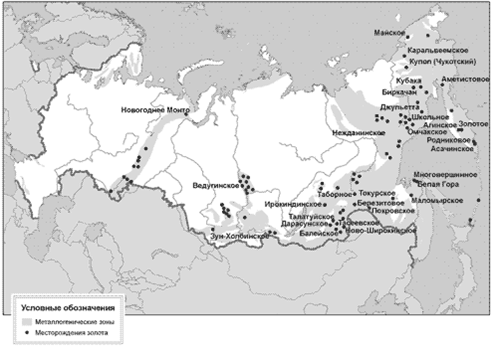 "+" – прирост производства и добычи в 2008 г. "–" – уменьшение производства и добычи в 2008 г., по данным Союза золотопромышленников. Часть экспертов полагало, что отступление назад в 2004 г. – явление временное и вызвано исключительно структурными изменениями отрасли (начало освоения новых месторождений не успело компенсировать падение добычи на старых рудниках). Недостаточность минерально-сырьевой базы в 2004 г. лишало отрасль устойчивого развития уже на ближайшую перспективу. По расчетам А. Кривцова и Б. Беневольского (ЦНИГРИ), имеющиеся рентабельные запасы коренного золота будут исчерпаны к 2015 г., россыпного – к 2011 г. В 2004 г. геолого-разведочные работы (ГРР) дали нулевой прирост прогнозных ресурсов россыпного золота категорий Р1 и Р2, в 2005 г. он составил всего 3% от суммарного прироста запасов месторождений золота всех геологопромышленных типов. Сейчас частные компании начинают осознавать важность геологоразведочных работ. Так, ЗАО "Полюс" в 2004 г. потратил на ГРР 20 миллионов долларов и примерно вдвое больше в 2005 году. В результате за 2006-2007 гг. было пройдено 143 тыс. пог. м скважин, что в 2,5 раза больше, чем в 2005 г. Этому примеру последовали многие крупные золото и алмазнодобывающие компании. Прирост добычи золота в России сдерживался медленным освоением крупных коренных месторождений золота, начало разработки которых откладывается на многие годы. Так, месторождение Сухой Лог в Иркутской области с запасами более тысячи тонн золота и стоимостью порядка 14 млрд долларов не передается в освоение с 2000 г. Претенденты до сих пор ждут условий акционирования. Добыча золота в 2005–2008 гг., по мнению председателя Союза золотопромышленников В. Брайко, стабилизирована, недропользователям позволено за счет собственных средств организовать поиск и разработку новых золоторудных объектов. А увеличить объемы добычи можно только с вводом новых мощностей рудника имени Матросова в Магаданской области и месторождения Сухой Лог в Иркутской.