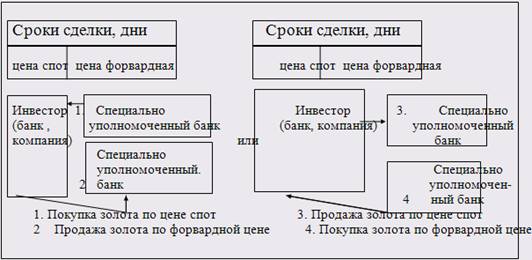 Рис.6 Схема сделок- swap Сделки своп по качеству металла - это покупка/продажа металла одного качества (по содержанию чистого металла или по типу слитков) и одновременная продажа/покупка металла другого качества. Сделки своп по местонахождению металла - это покупка/ продажа металла с изменением его местонахождения путем перевода металла по счетам и/или путем физической его поставки. Сделки своп по времени - это покупка/продажа металла на условиях обратной продажи/покупки того же количества металла другой датой валютирования". Опционы - это сделки, по которым одна сторона предоставляет другой стороне за определенное вознаграждение (премию) право покупки/продажи определенного количества металла по заранее согласованной цене исполнения на заранее оговоренную дату истечения опциона. Существуют два основных вида опциона: · кол-опцион - сделка, по которой продается/покупается право покупки металла; · пут-опцион - сделка, по которой продается/покупается право продажи металла. Сторона, получившая право купить/продать металл и уплатившая другой стороне премию, может воспользоваться этим правом в оговоренный день истечения опциона или же отказаться от него. При этом премия не возвращается независимо от того, воспользовался покупатель своим правом или нет. Сделки купли-продажи металлов при исполнении опционов совершаются, как правило, на условиях спот. Операции (сделки) с металлами могут различаться также по способу работы с контрагентом и подразделяться на операции: торговые; клиентские; арбитражные. Торговые операции представляют собой покупку металлов у недропользователей на основе ежегодно заключаемых договоров купли-продажи металлов, или продажу металлов, купленных у недропользователей. Клиентские операции с металлами - это операции, проводимые банком в соответствии с поручениями клиентов в рамках заключенных договоров комиссии. За выполнение клиентских поручений банк получает вознаграждение в соответствии с условиями договора комиссии. Поручение клиента банк выполняет либо путем заключения соответствующей сделки непосредственно с клиентом, либо через посредническую организацию, с которой банк заключает договор комиссии. Арбитражные операции с металлами - это операции, осуществляемые банком от своего имени и за свой счет на международном и российском рынках в целях получения дополнительной прибыли и постоянного присутствия на указанных рынках. Арбитражные операции с металлами предусматривают покупку/продажу определенного количества металла или производного от металла финансового инструмента (форвардного или опционного контракта) с последующей продажей/покупкой того же количества металла или финансового инструмента. Операции (сделки) с металлами и драгоценными камнями в зависимости от конкретных обстоятельств могут осуществлять различные подразделения банка (или специализированное, если объем соответствующих операций достаточно большой, или валютное, или казначейство, или дилинговое). Соответствующее подразделение также должно взять на себя все функции, связанные сданным направлением деятельности банка, включая установление оптовых и розничных цен банка на драгоценные металлы и камни, расчеты с клиентами, а при необходимости - организацию транспортировки, страхования, хранения, экспорта драгоце