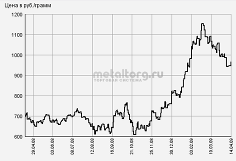 Лондонский фиксинг на золото, дважды в день устанавливаемый London Gold Market Fixing Limited, является главным ориентиром для участников рынка, цена фиксинга используется практически во всех контрактах, заключаемых на поставку физического золота. Фиксинг - определение ведущими участниками рынка равновесной цены драгоценного металла в конкретный момент времени на основе соотношения существующего спроса и предложения. Лондонский фиксинг на золото впервые был установлен 12 сентября 1919г. Фиксинг по золоту в Лондоне производится 2 раза в день: в 10:30 (утренний фиксинг) и в 15:00 (вечерний фиксинг) по лондонскому времени представителями пяти крупнейших мировых банков (Scotia Mocatta, HSBC, Deutsche Bank, Societe Generale, Barclays Capital), каждый из которых является членом Ассоциации участников золотого рынка (London Bullion Market Association). Центральный банк Российской Федерации (Банк России) каждый рабочий день осуществляет расчет учетных цен исходя из действующих на момент расчета значений фиксинга на золото на лондонском рынке наличного металла "спот", и пересчитывается в рубли по официальному курсу доллара США к российскому рублю, действующему на день, следующий за днем установления учетных цен. ОАО АКБ "Сберегательный банк Российской Федерации" осуществляет покупку-продажу мерных золотых слитков массой от 1 до 1000 граммов, открытие и ведение обезличенных металлических счетов в золоте. Приведенные в таблице цены соответствуют котировкам продажи и покупки драгоценных металлов банком в обезличенном виде. ОАО "Банк Москвы" осуществляет торговлю мерными слитками золота весом 1, 5, 10, 20, 50, 100, 250, 500, 1000 грамм, проба металла 99,99 %, а также открытие текущих (до востребования) обезличенных металлических счетов в золоте. Приведенные в таблице цены соответствуют Индикативным курсам безналичных драгоценных металлов банка для объема операции до 11999,9 грамм. ОАО АКБ "Росбанк" осуществляет торговлю мерными слитками золота и открытие обезличенных металлических счетов в золоте. Приведенные в таблице цены соответствуют курсу покупки-продажи драгоценных металлов банком по обезличенным металлическим счетам для сделок на сумму, не превышающую $50 000. Для сделки, превышающей данный порог, курс устанавливается Департаментом казначейских операций банка индивидуально. Цены приведены в долларах США за тройскую унцию (31,1034768 граммов) по курсу ЦБ РФ на дату выставления цены. Серебро Динамика цен с 29.04.2008 по 14.04. 2009