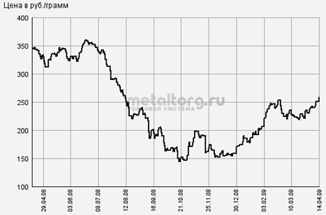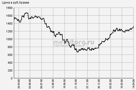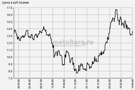 Лондонский фиксинг на серебро, устанавливаемый один раз в день London Silver Market Fixing Limited, является главным ориентиром для участников рынка, цена фиксинга используется практически во всех физических контрактах. Фиксинг - определение ведущими участниками рынка равновесной цены драгоценного металла в конкретный момент времени на основе соотношения существующего спроса и предложения. Лондонский фиксинг на серебро впервые был установлен в 1897 году. Фиксинг по серебру в Лондоне проводится только один раз в день в 12.00 GMT (15.00 МСК) представителями трех крупнейших мировых банков (Scotia Mocatta, HSBC, Deutsche Bank). Центральный банк Российской Федерации (Банк России) каждый рабочий день устанавливает цену на серебро на основе дневного фиксинга на лондонском "спот"-рынке наличного металла предшествующего дня, и пересчитывает в рубли по официальному курсу доллара США к российскому рублю, действующему на день, следующий за днем установления учетных цен. ОАО АКБ "Сберегательный банк Российской Федерации" осуществляет покупку-продажу мерных серебряных слитков массой 100, 250, 500 и 1000 граммов, открытие и ведение обезличенных металлических счетов в серебре. Приведенные в таблице цены соответствуют котировкам продажи и покупки драгоценных металлов банком в обезличенном виде. ОАО "Банк Москвы" осуществляет открытие текущих (до востребования) обезличенных металлических счетов в серебре. Приведенные в таблице цены соответствуют Индикативным курсам безналичных драгоценных металлов банка для объема операции до 11999,9 грамм. ОАО АКБ "Росбанк" осуществляет открытие обезличенных металлических счетов в серебре. Приведенные в таблице цены соответствуют курсу покупки-продажи драгоценных металлов банком по обезличенным металлическим счетам для сделок на сумму, не превышающую $50 000. Для сделки, превышающей данный порог, курс устанавливается Департаментом казначейских операций банка индивидуально. Цены приведены в долларах США за тройскую унцию (31,1034768 граммов) по курсу ЦБ РФ на дату выставления цены. Платина Динамика цен с 29.04.2008 по 14.04 2009