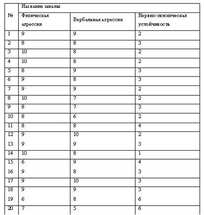 Таблица 2. Результаты замера по шкалам «физическая и вербальная агрессия» и шкале «нервно – психическая устойчивость».
